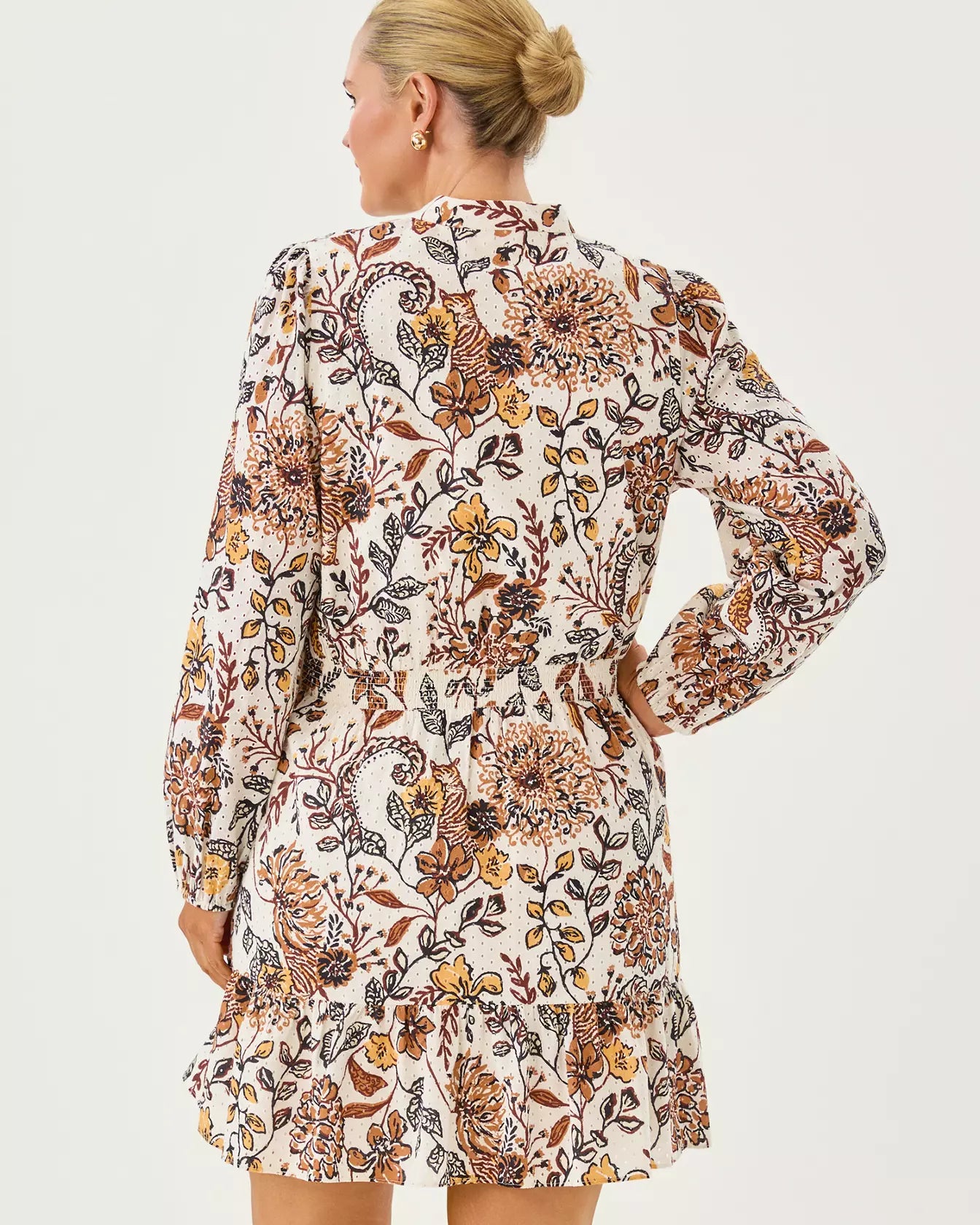 - Easy fit, notch neck dress with a stand collar, smocked waist, long sleeves, and a hem ruffle.
