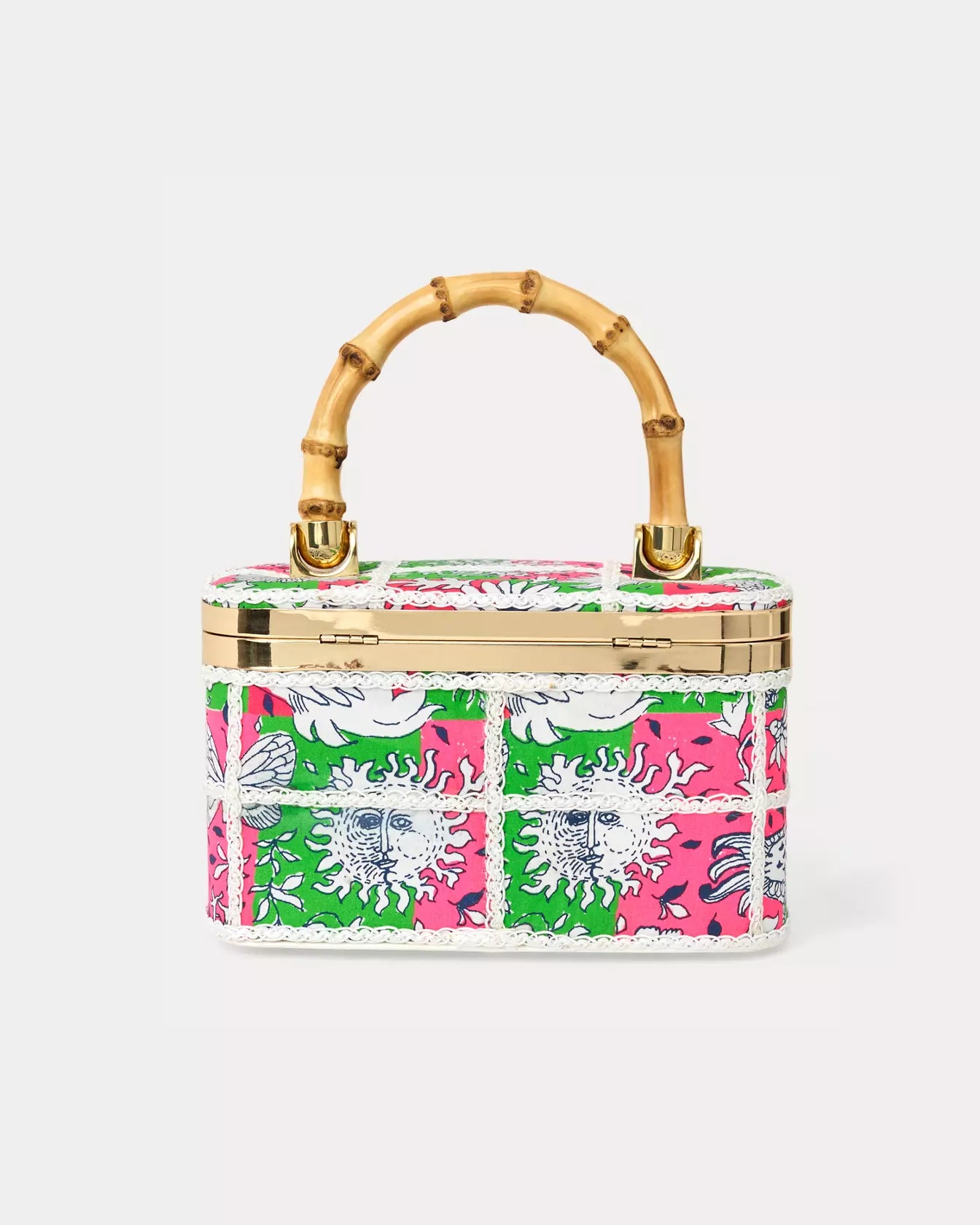 • Printed bamboo top handle bag with Lilly lace trim and a gold metal encased lid closure.