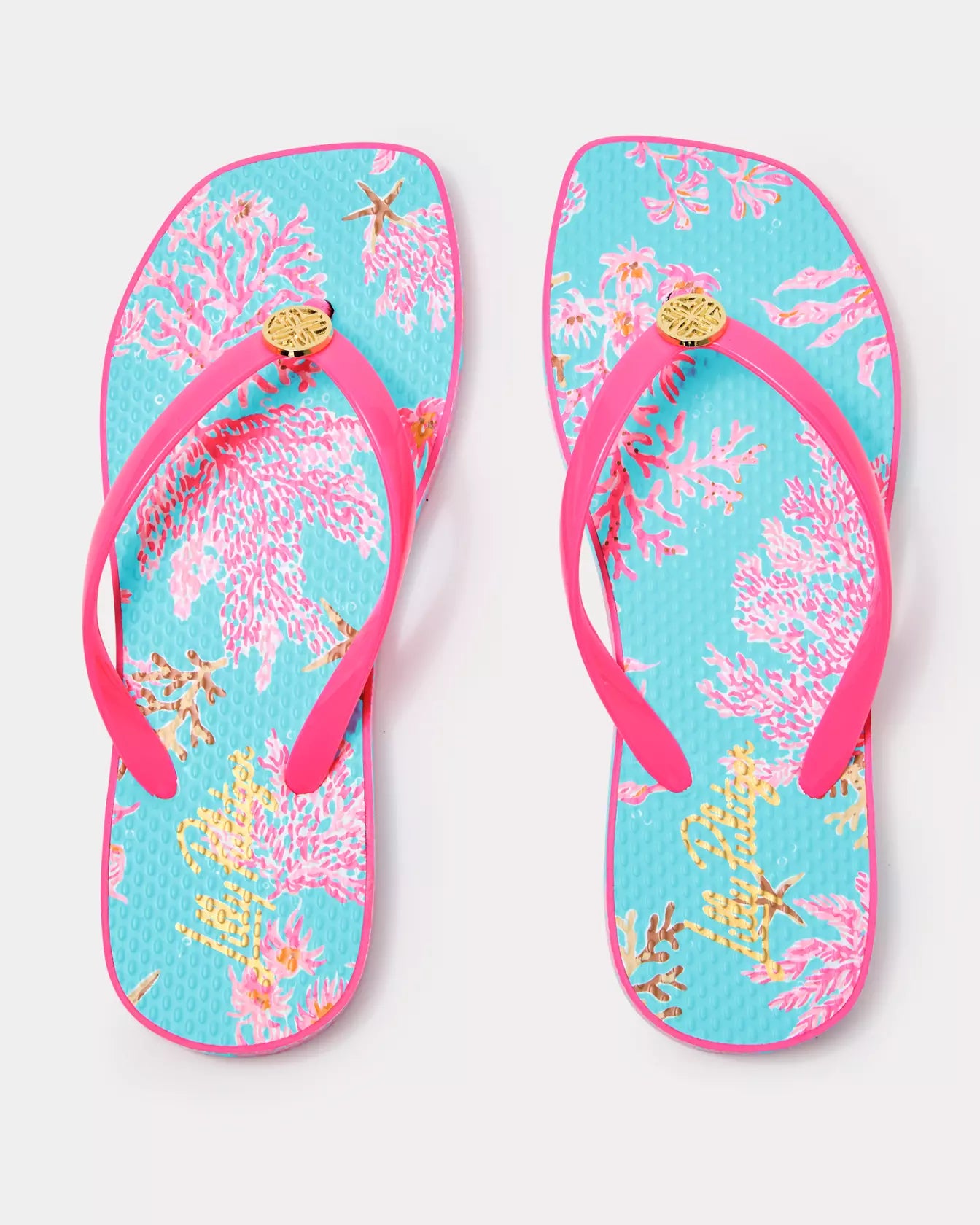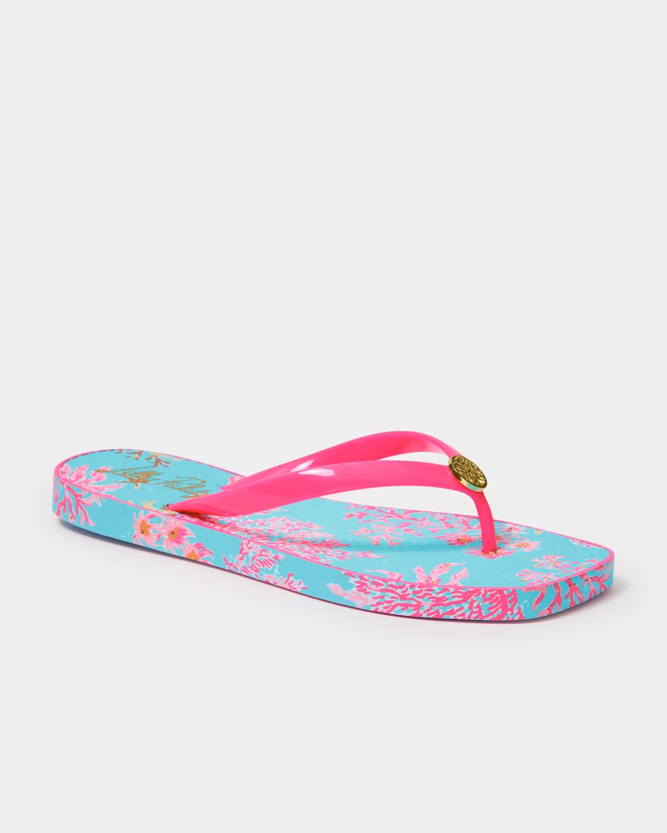 - Printed, square toe flip flop with a jelly upper and signature logo hardware.