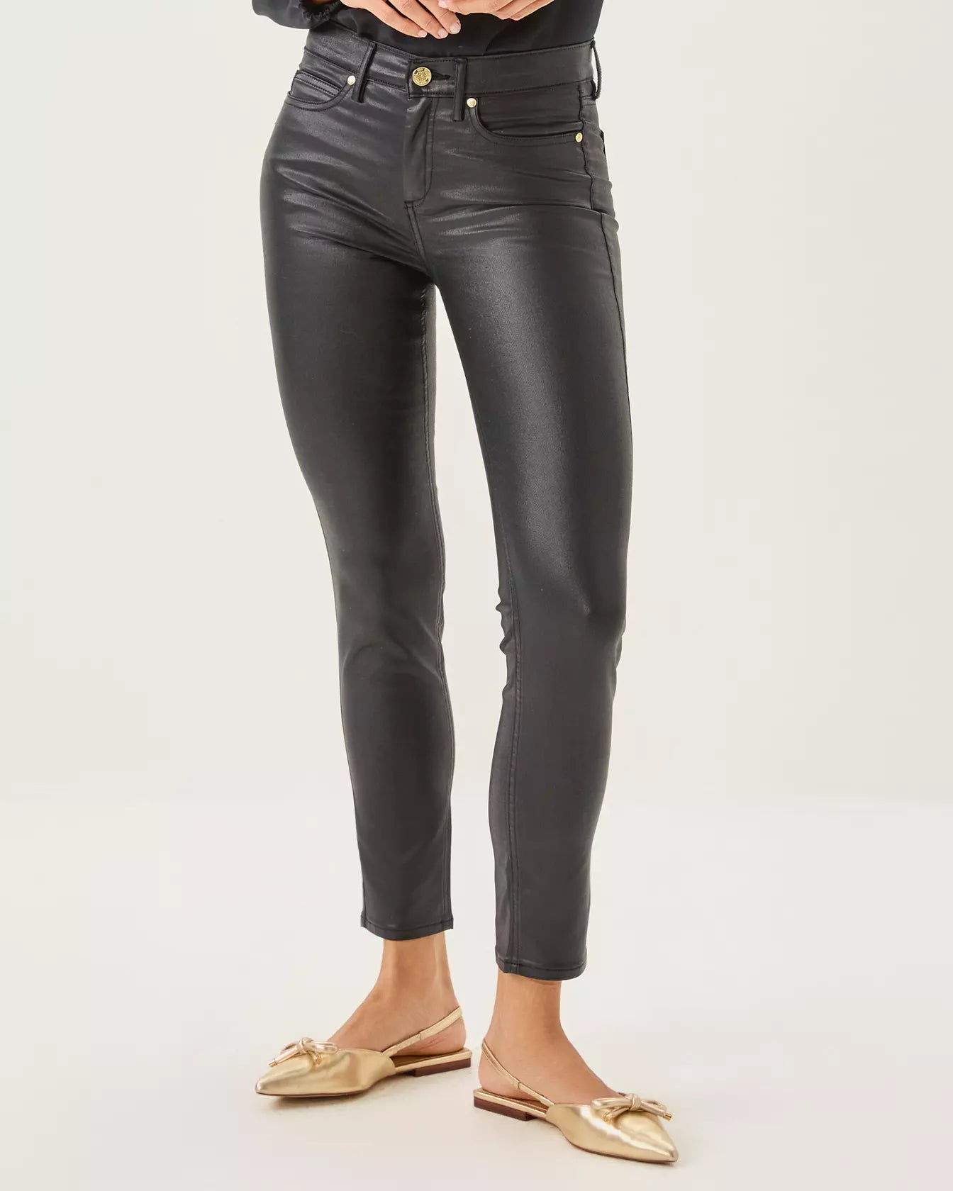 - Black Coated Stretch Denim (59% Rayon, 39% Polyester, 2% Spandex).