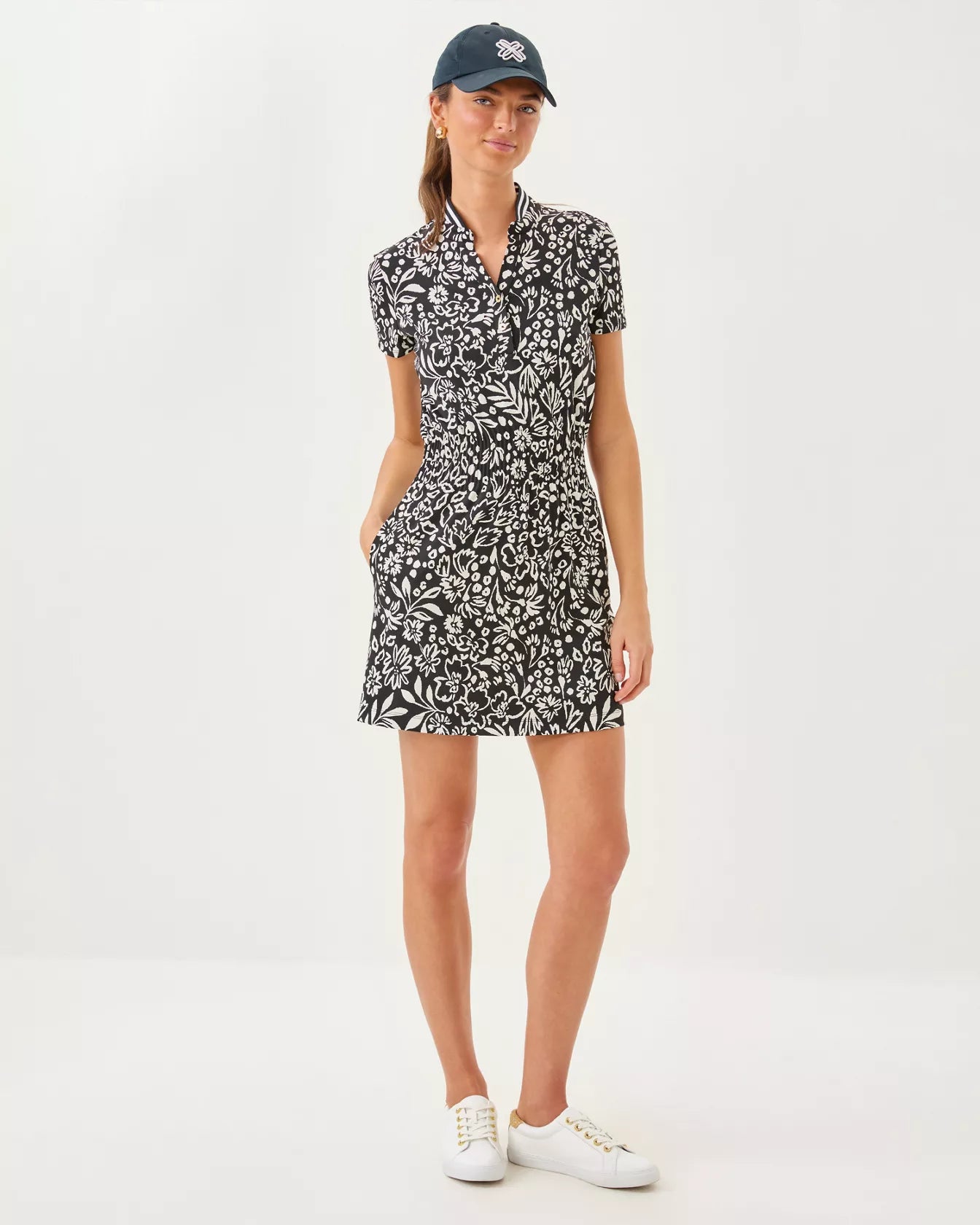 - UPF 50+ Luxletic® active polo dress with a rib collar, gold buttons, smocked waist, and side seam pockets. This style also features separate undershorts with pockets.