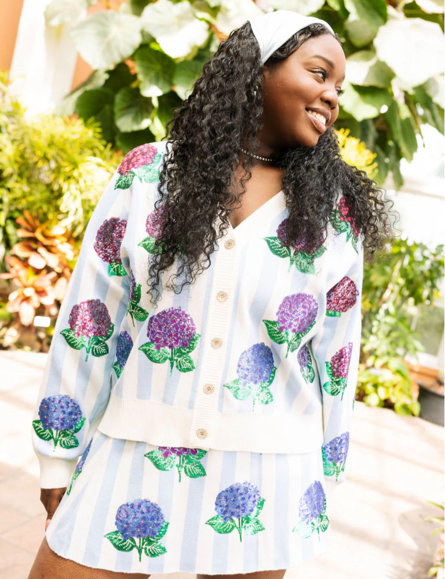 Blue & White Striped Hydrangea Cardigan and Skirt Set