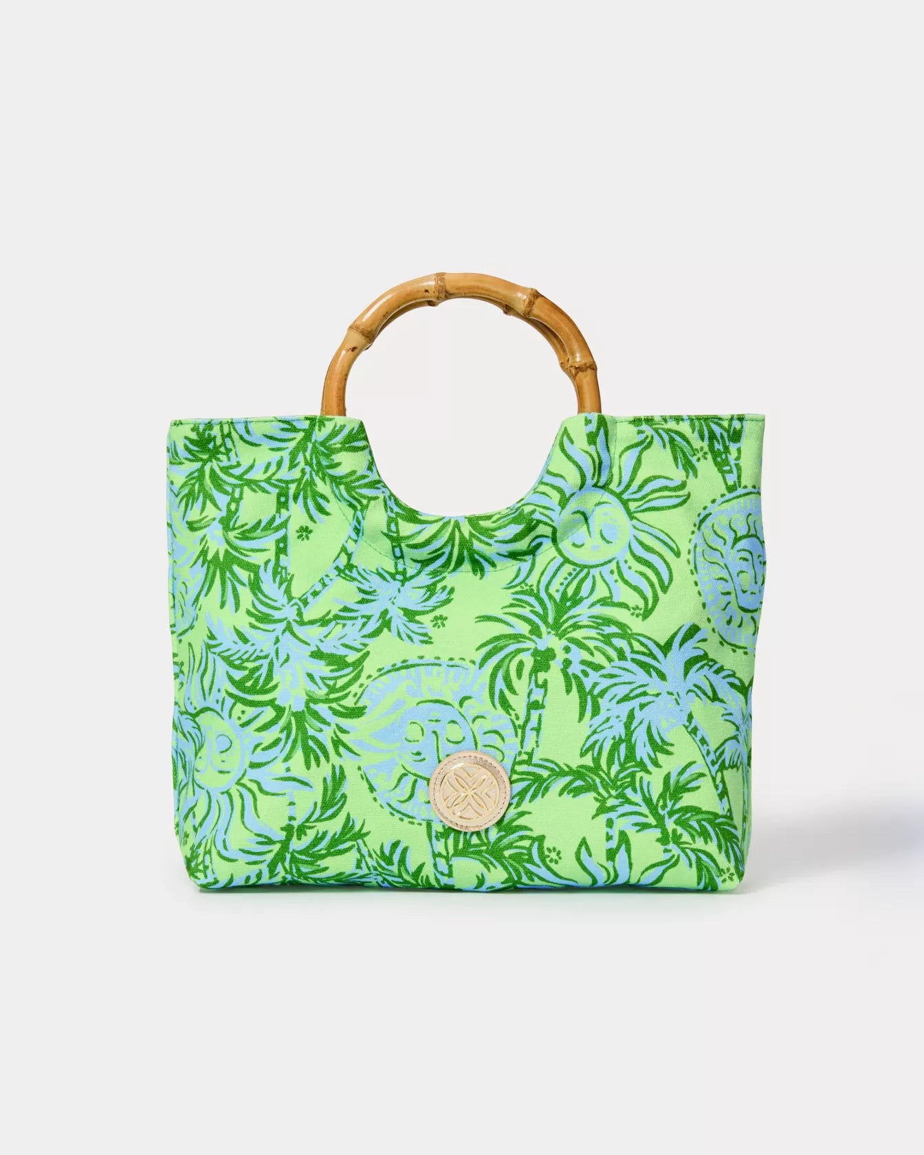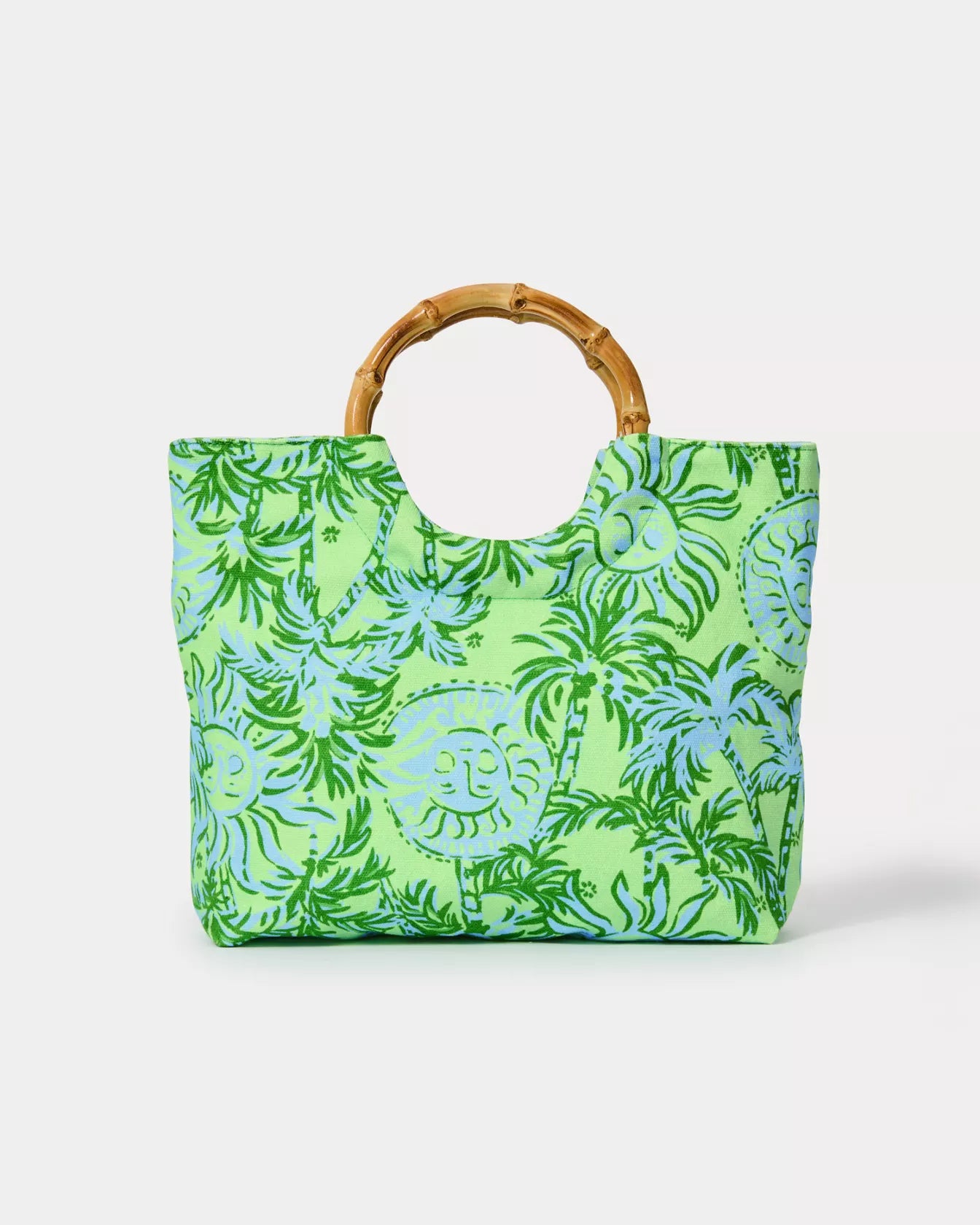 - Bag with round natural bamboo top handles, a top zip closure, and an interior hanging zip pocket.