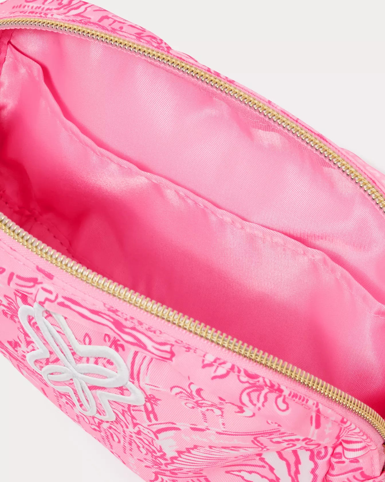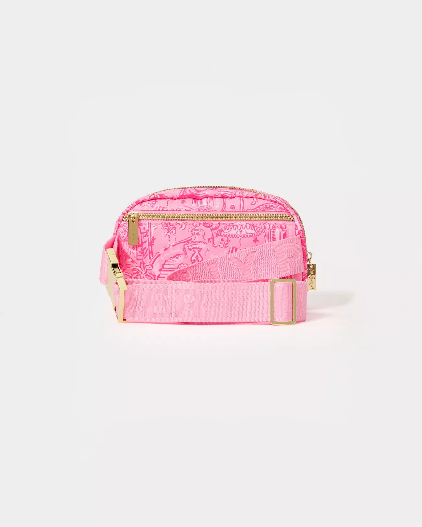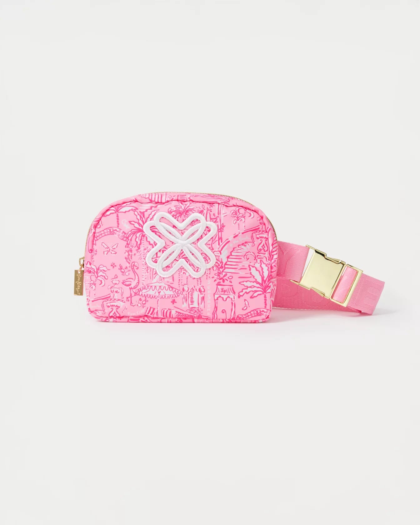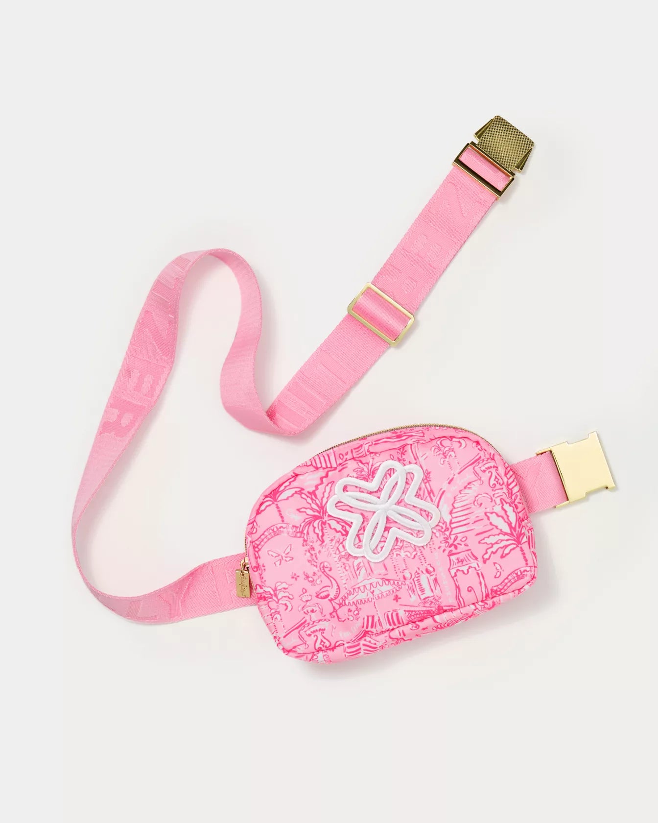 - Belt bag with a zip top closure, zip back pocket, and an embroidered logo. This style also features an adjustable webbing strap with a gold metal buckle closure.