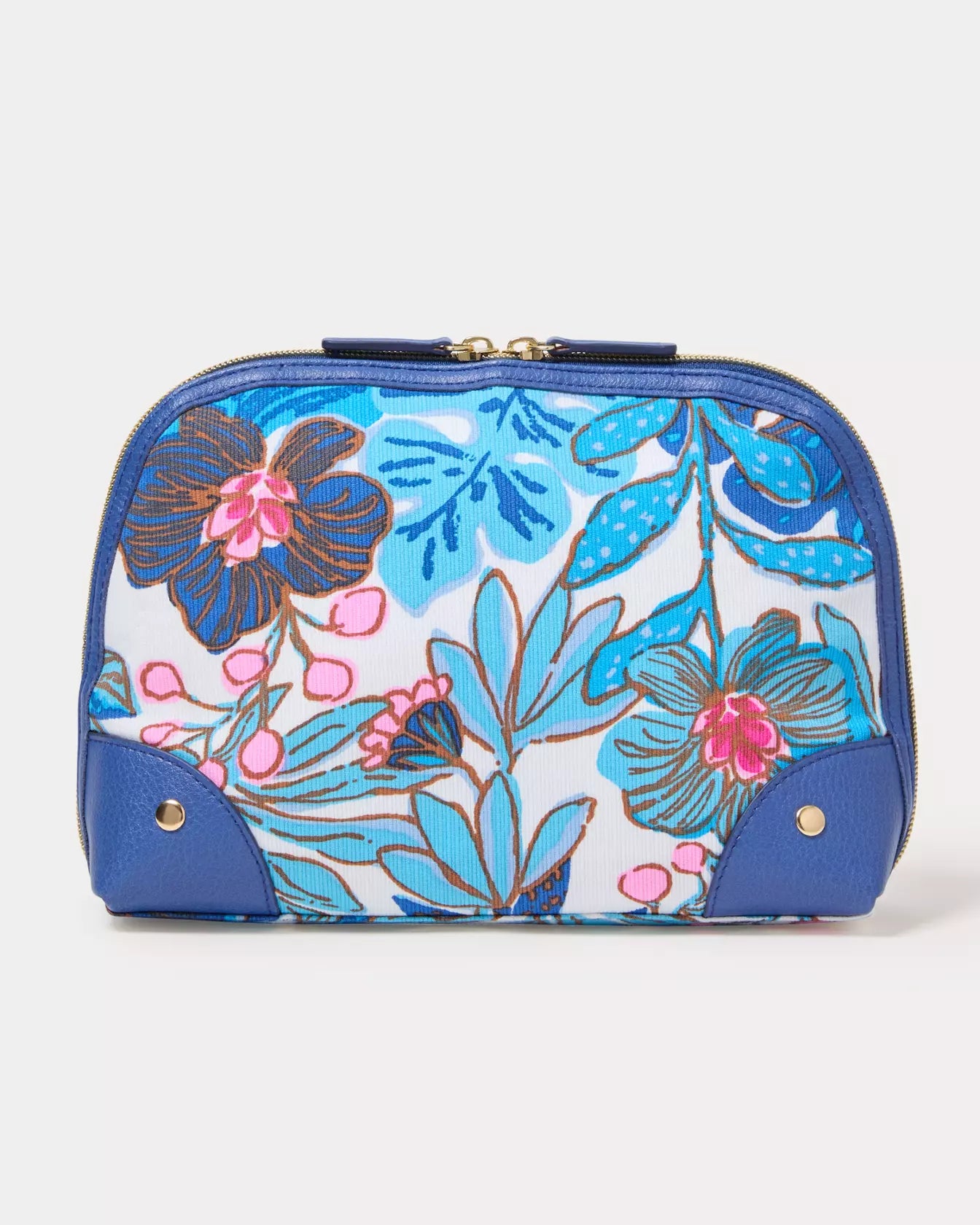 - Printed vintage dobby cosmetic pouch with contrast trim and a zip top closure.