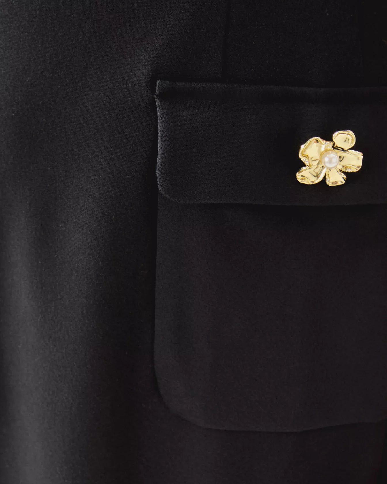 - Fit-and-flare, crew neck dress with short sleeves, seam details, and patch pockets with novelty gold buttons.