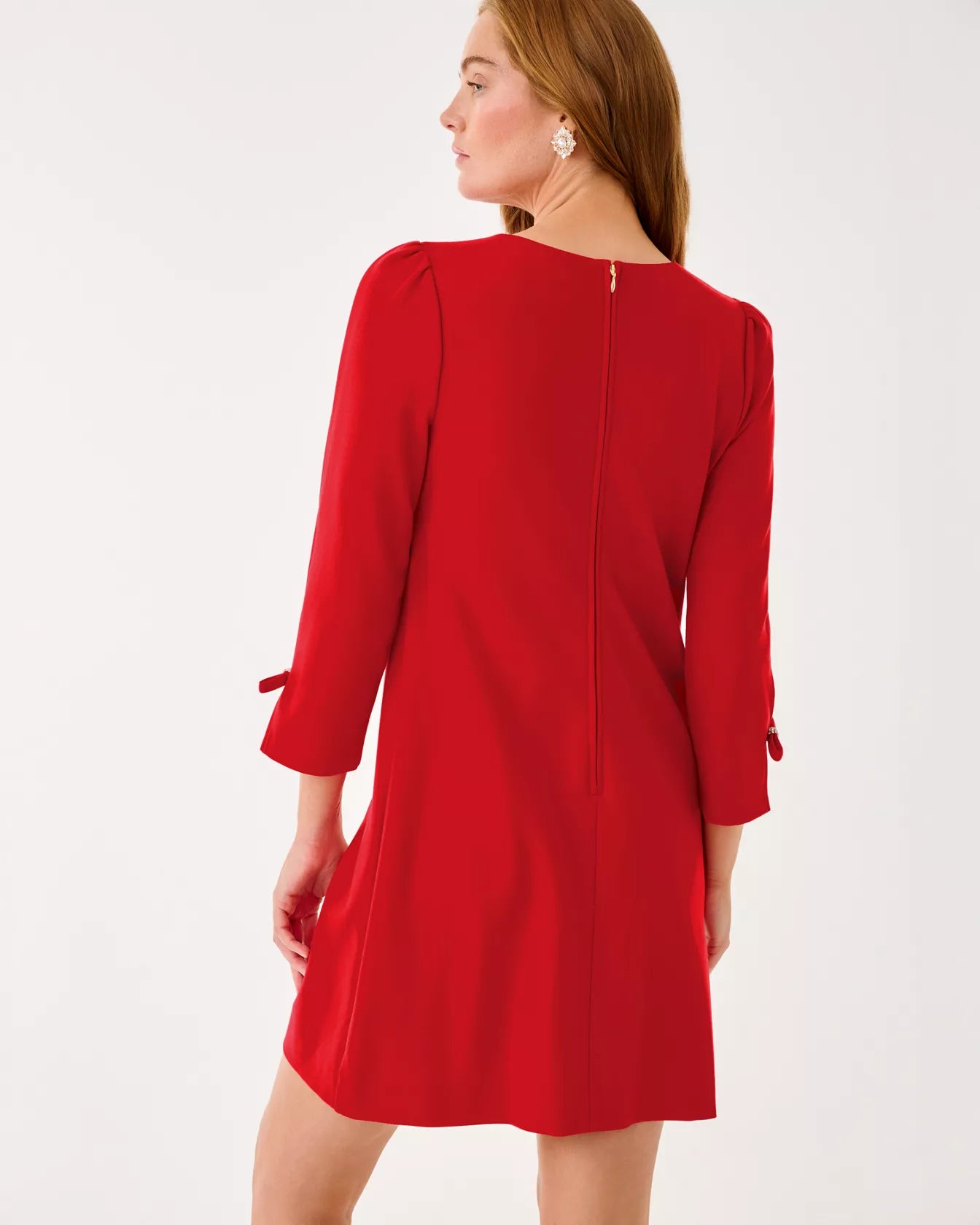 - Straight fit, crew neck shift dress with 3/4 length sleeves and rhinestone bows at the neckline and sleeves.