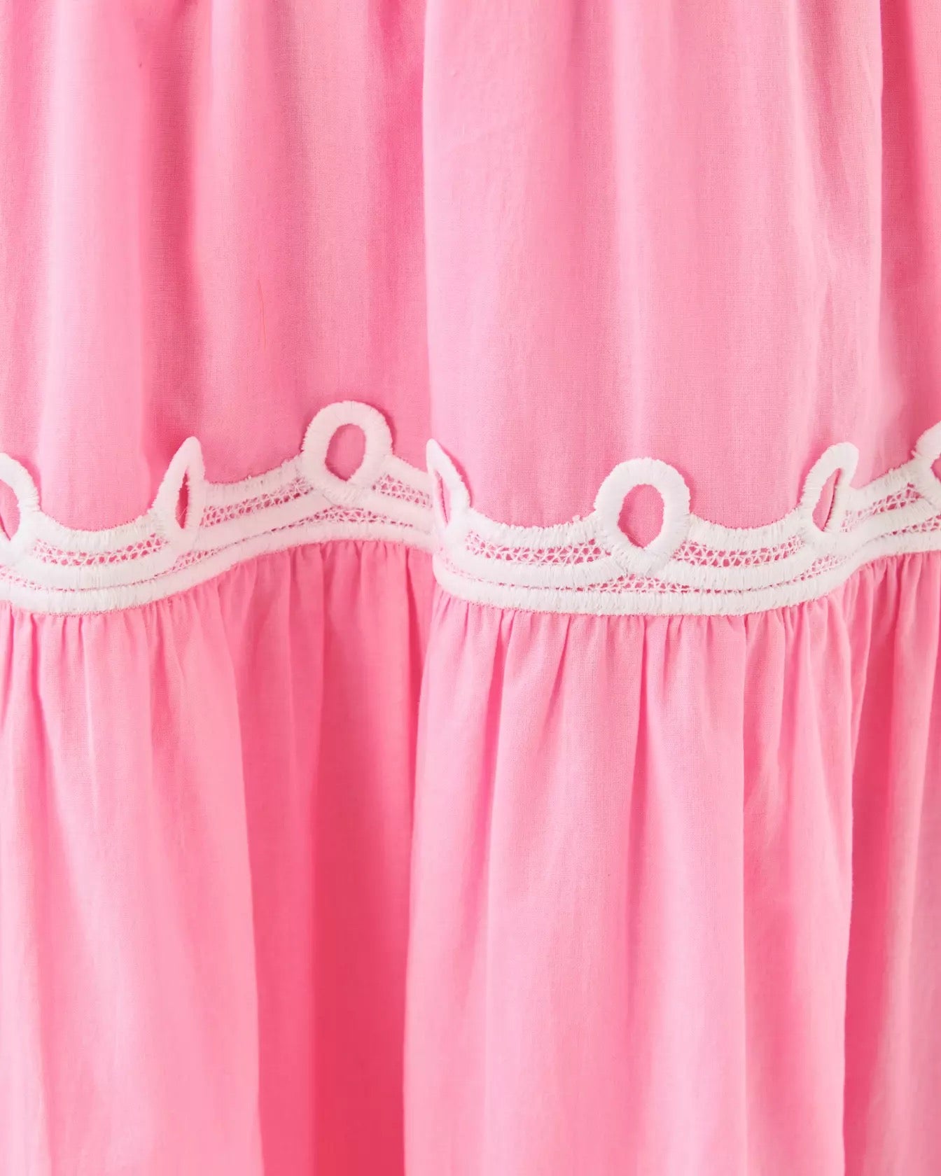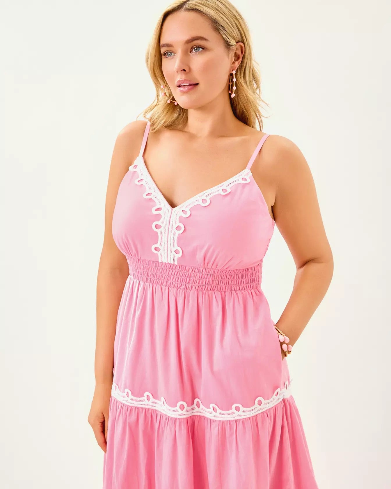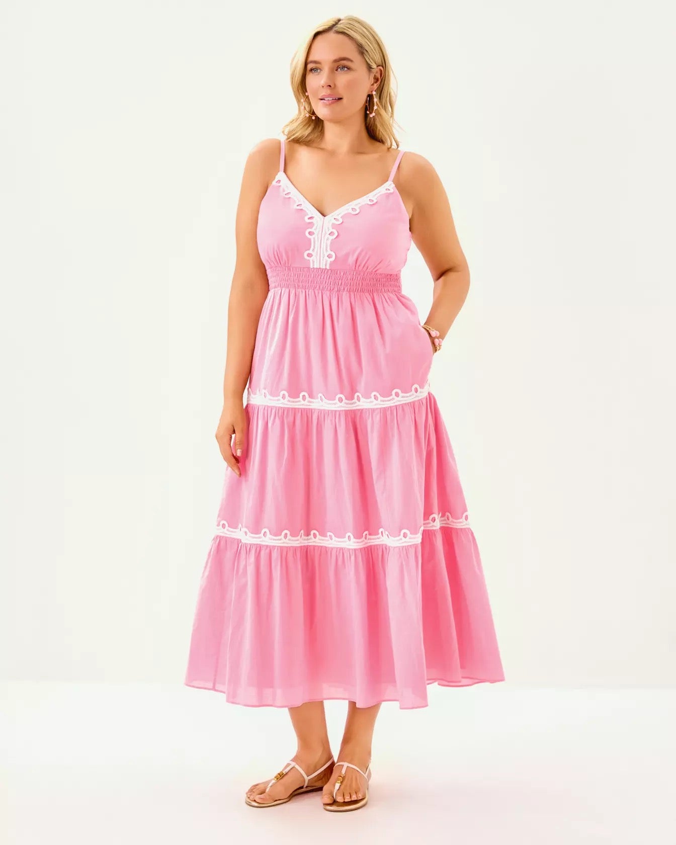 - Fit-and-flare midi dress with adjustable spaghetti straps, bodice cups, and a smocked waistband and back panel. This style also features a tiered skirt and side seam pockets.
