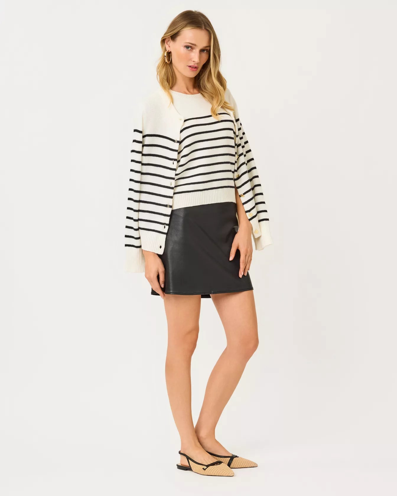 - High-rise, straight fit skirt with a side zipper, waistband, and back welt pockets.