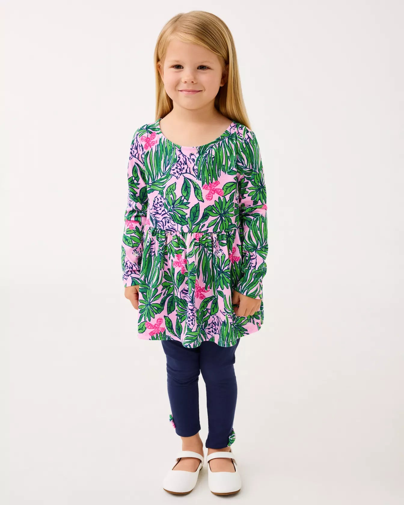 - Easy fit tunic top with long sleeves, a peplum flounce, snap shoulder opening, and a wide neckline. Includes coordinating pull-on leggings with hem bows.