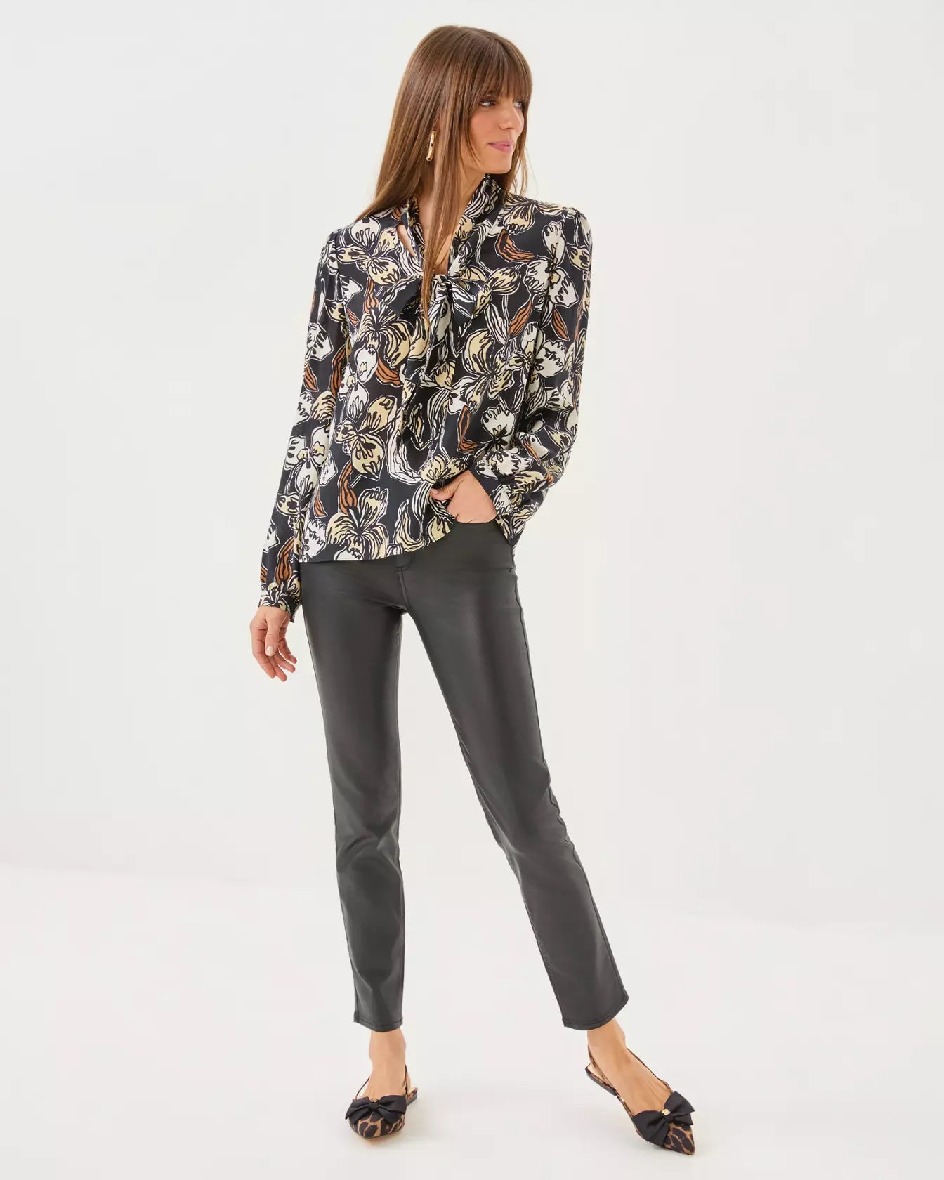 - Straight fit, v-neck, long sleeve top with a scarf bow neck detail.