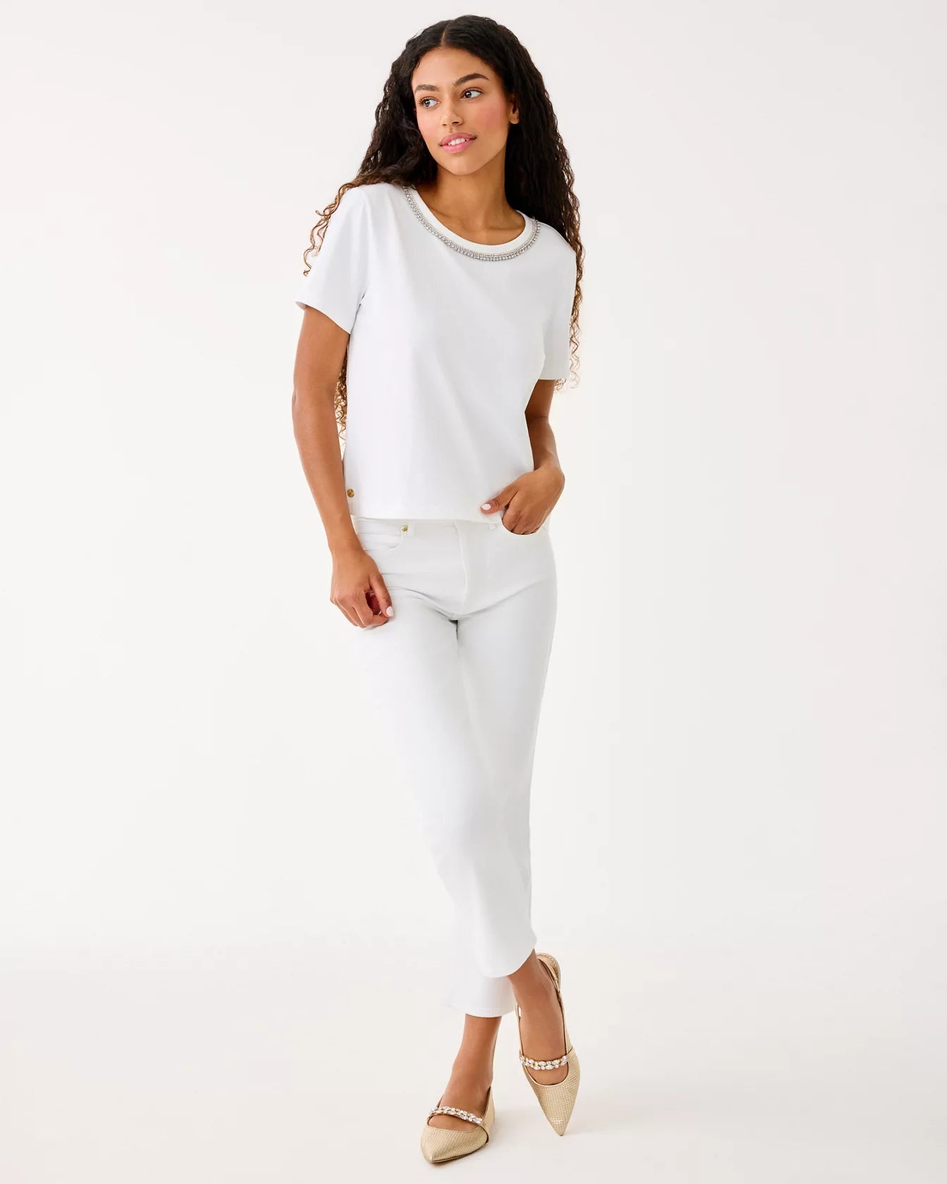 - Straight fit top with short sleeves and an embellished crew neckline.