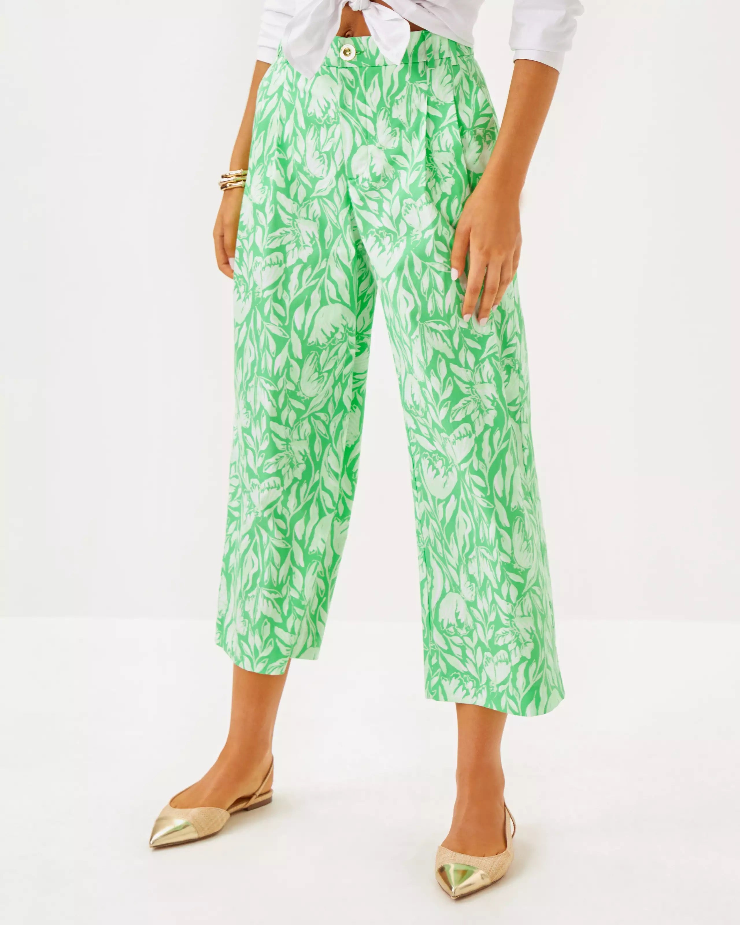 - High rise, relaxed fit pant with a wide cropped length. Style also features interior waistband elastic construction for added comfort.