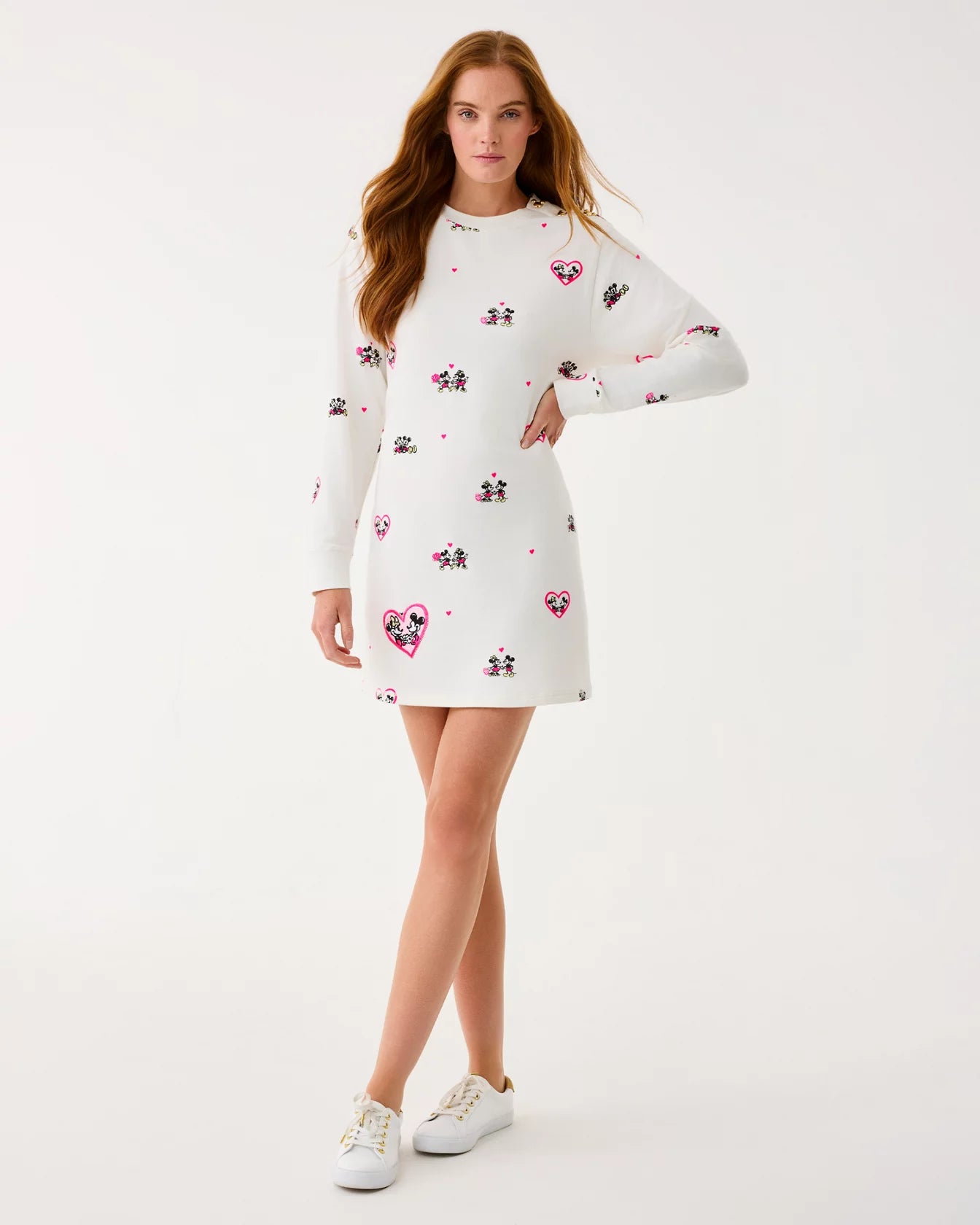 • Relaxed fit, oversized sweatshirt dress with novelty Mickey buttons at the shoulder and an embroidered heart patch.