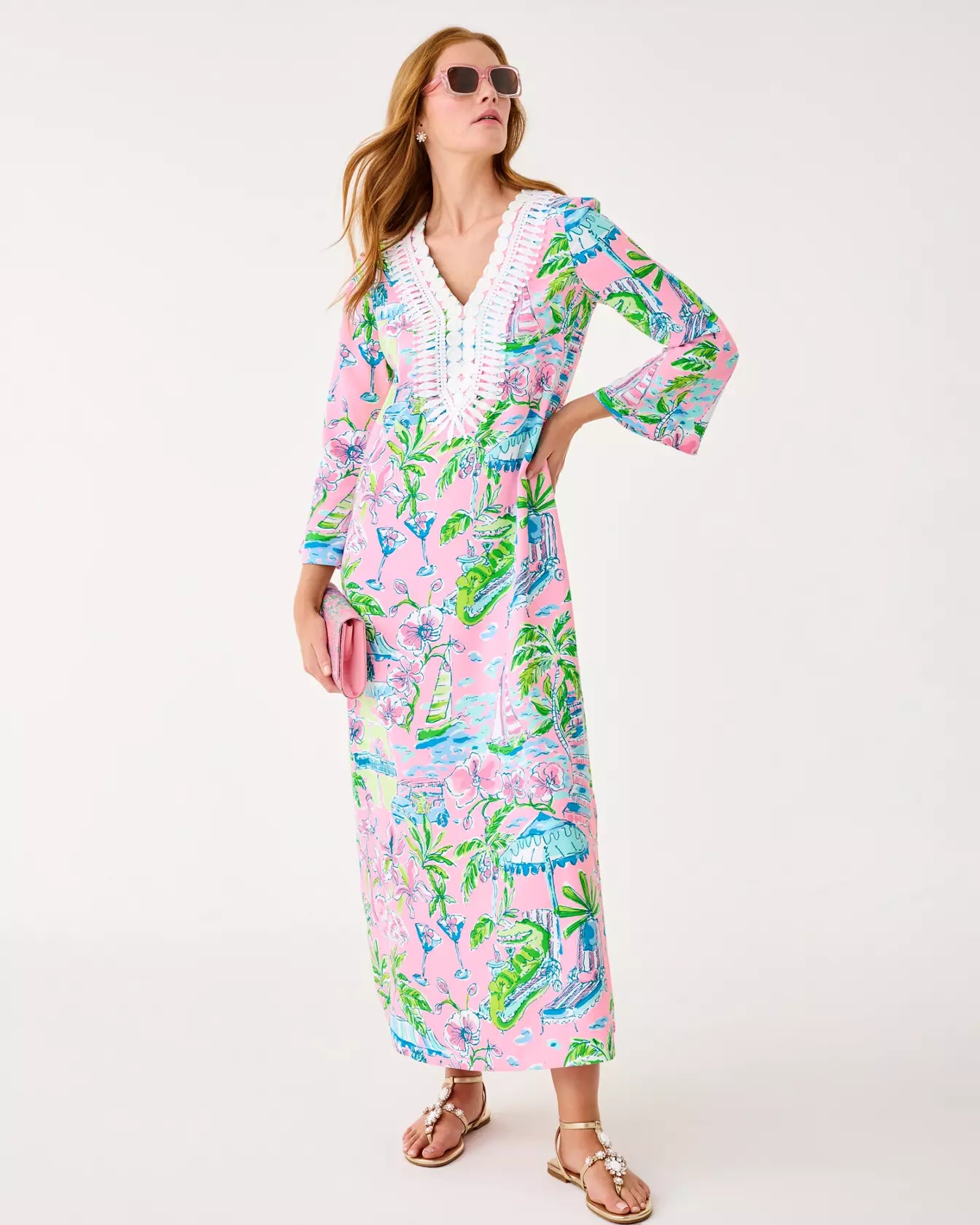 - Easy fit, v-neck, maxi caftan dress with flare sleeves, side slits, and a Lilly lace neckpiece.