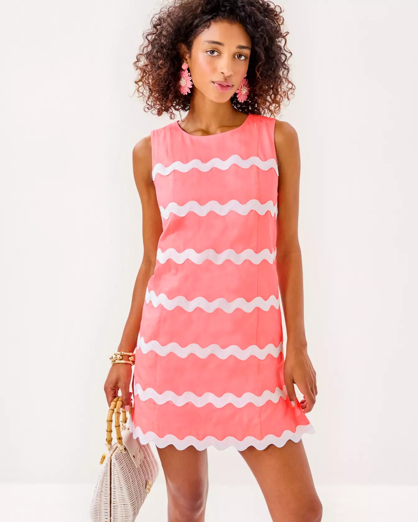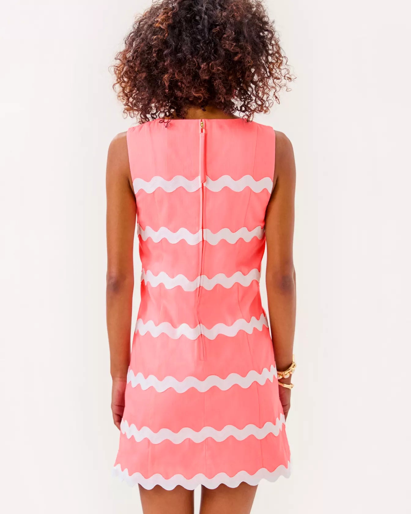 - Sleeveless shift romper with top applied ric rac trim and princess seams.