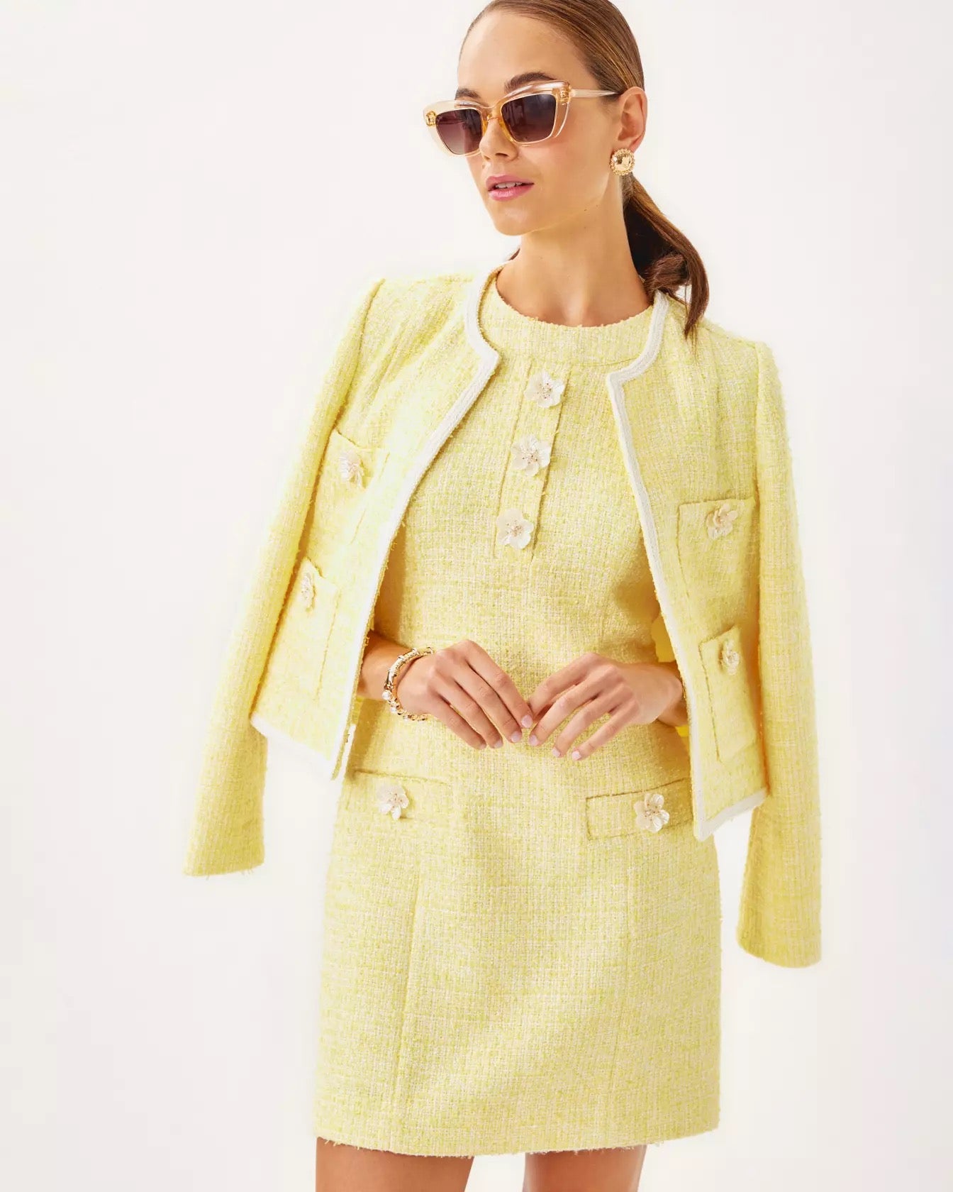 Celebrate in vibrant Lilly style with our tailored Margarete Boucle Skirted Romper.