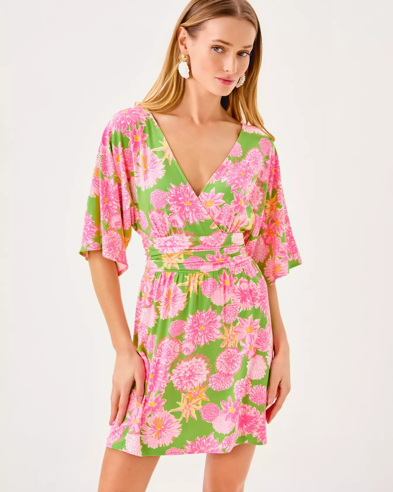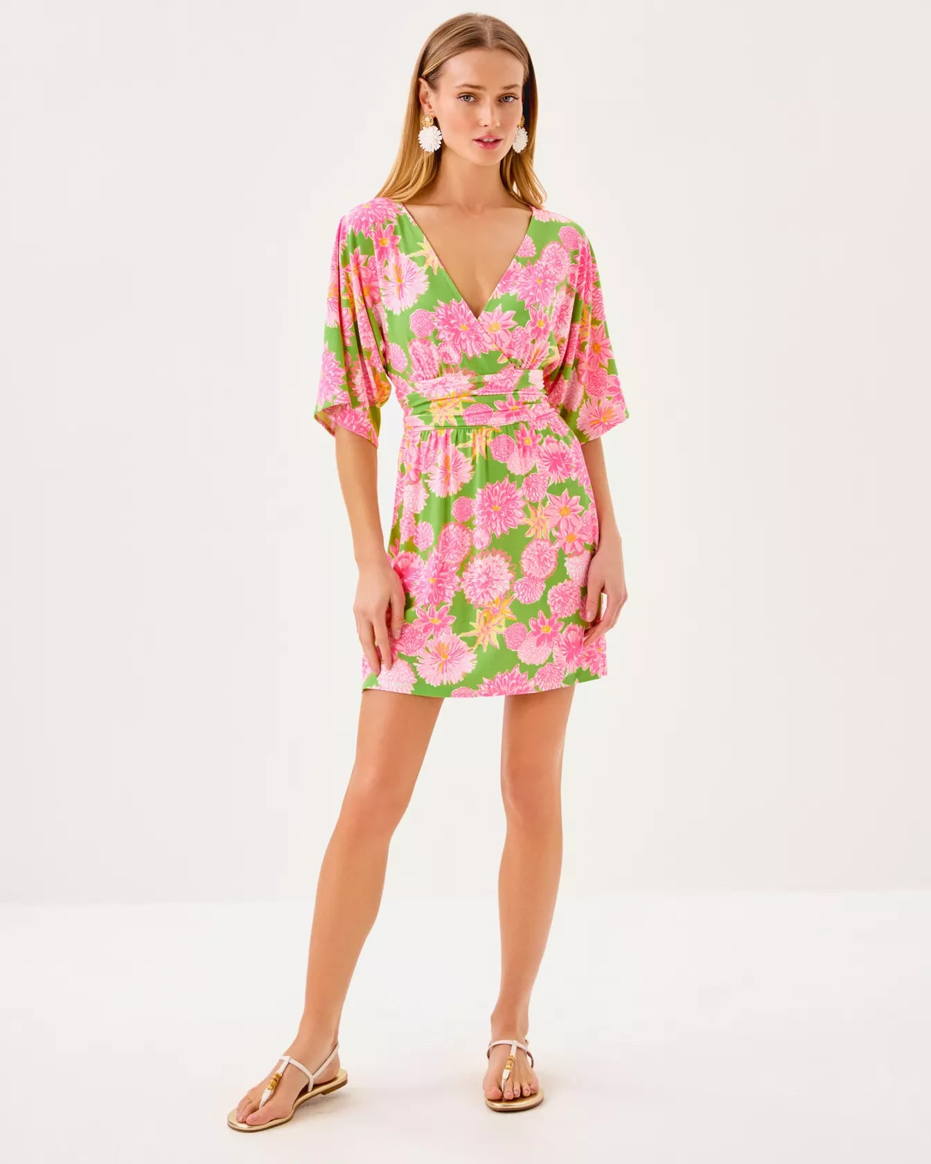 - Skirted romper with a surplice neckline, elbow-length kimono sleeves, and a ruched waistband.