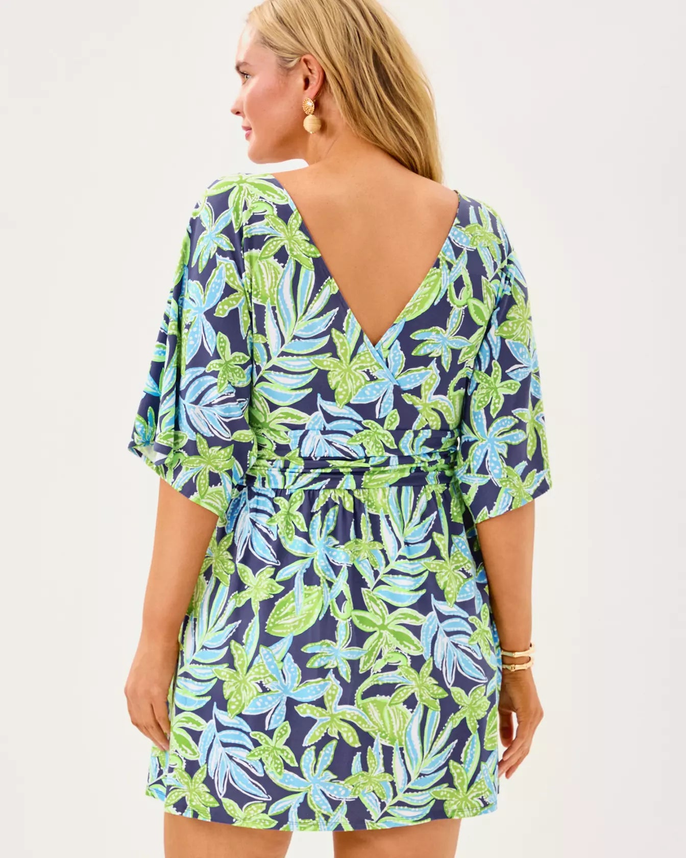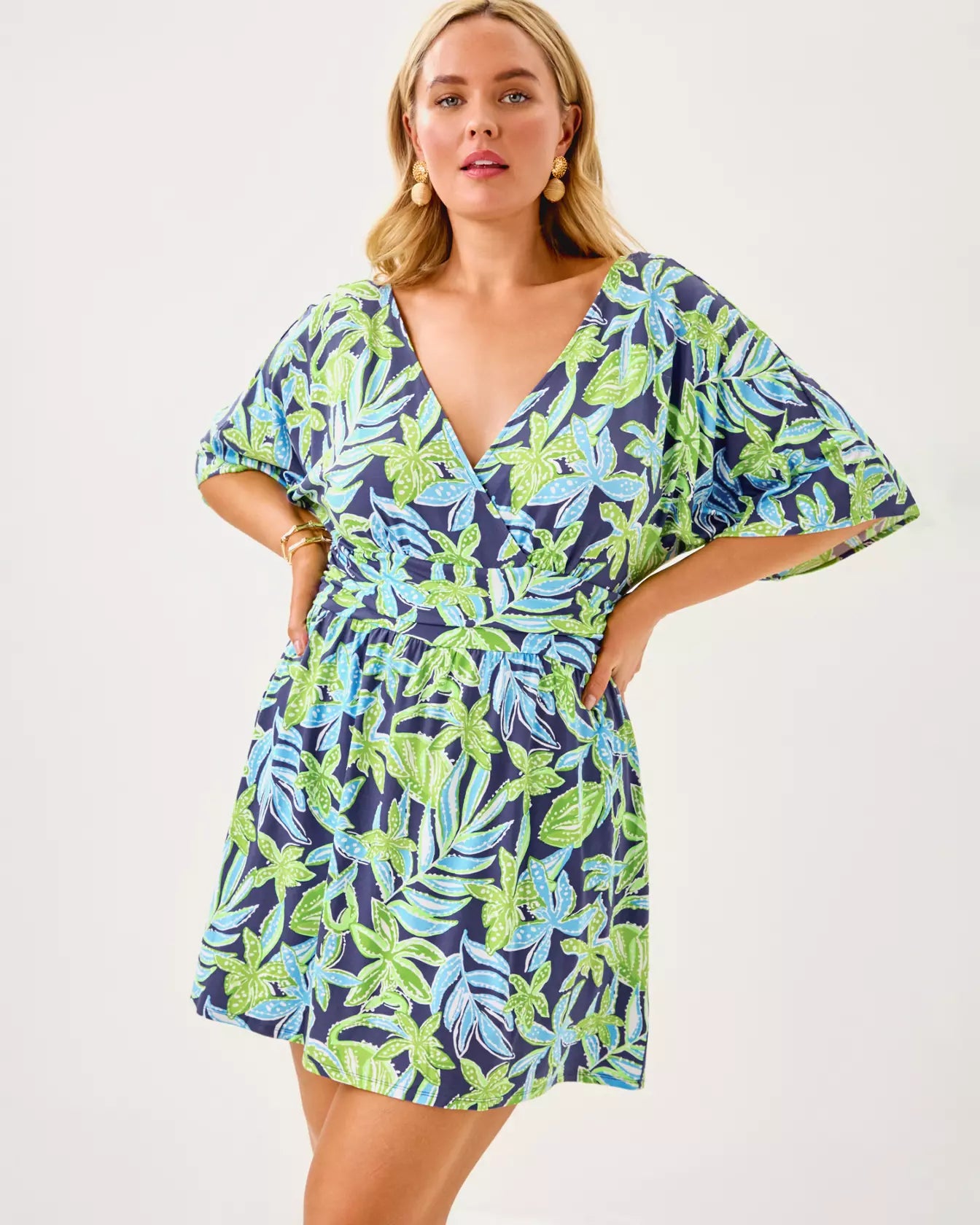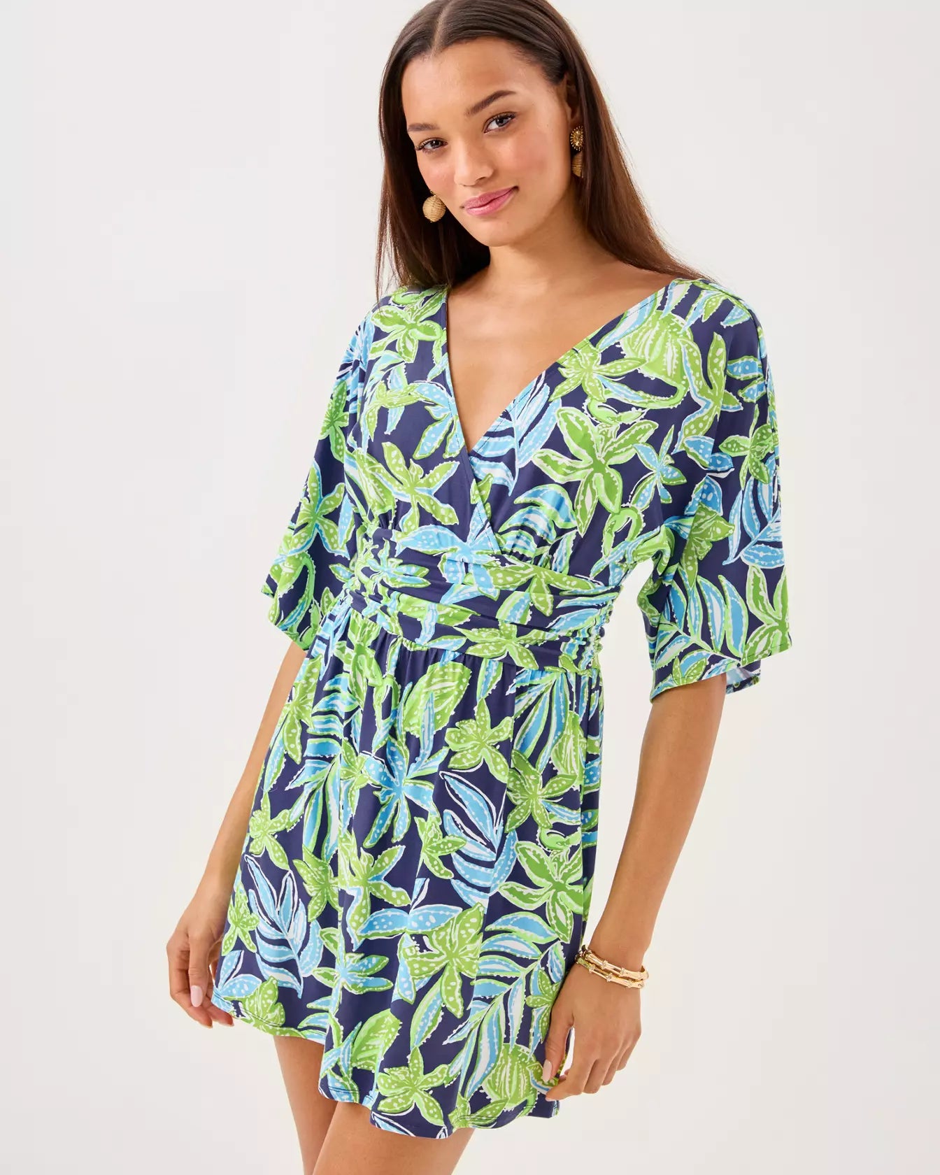 - Skirted romper with a surplice neckline, elbow-length kimono sleeves, and a ruched waistband.