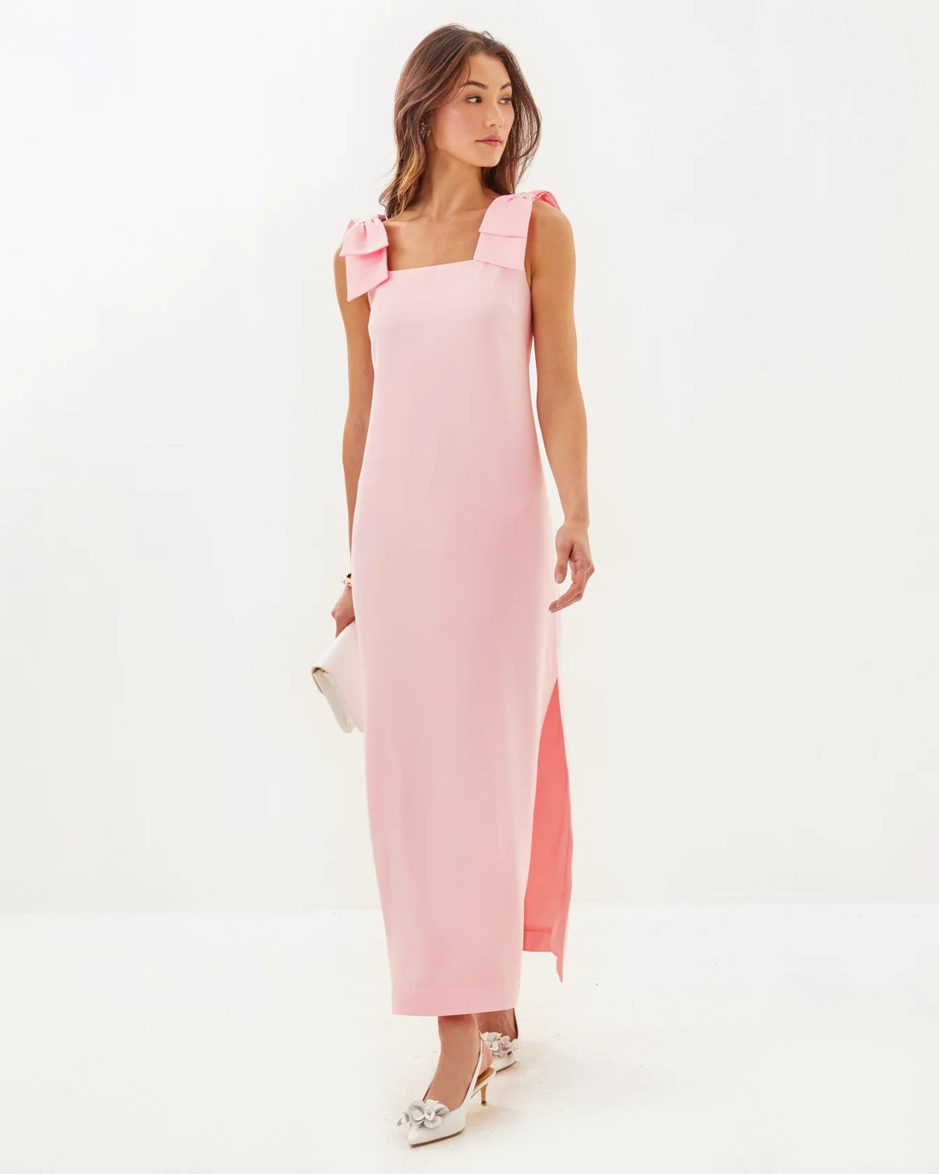 - Straight fit maxi dress with shoulder bows and side slits.