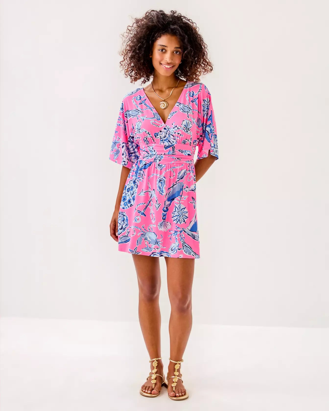 - Skirted romper with a surplice neckline, elbow-length kimono sleeves, and a ruched waistband.