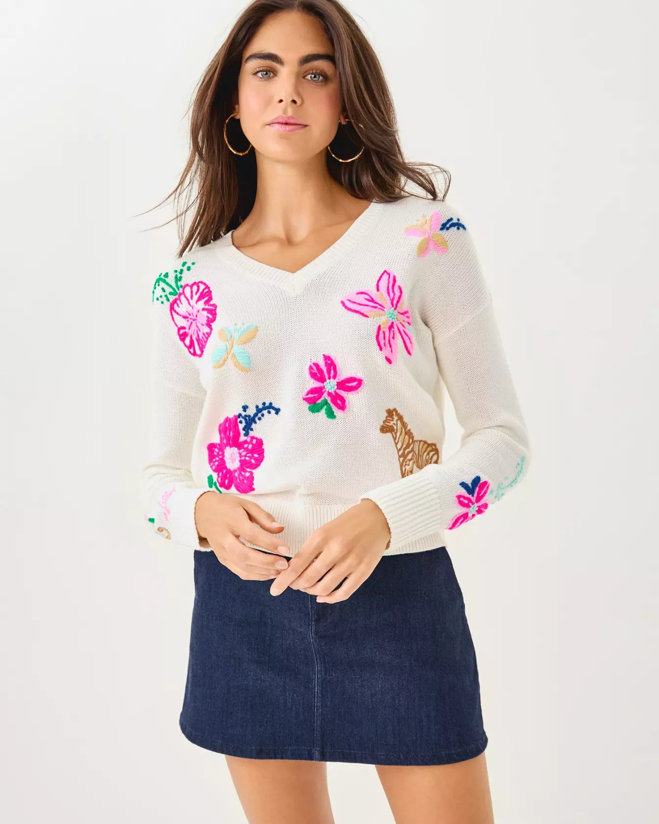 • Easy fit, long sleeve, v-neck sweater with embroidered details.