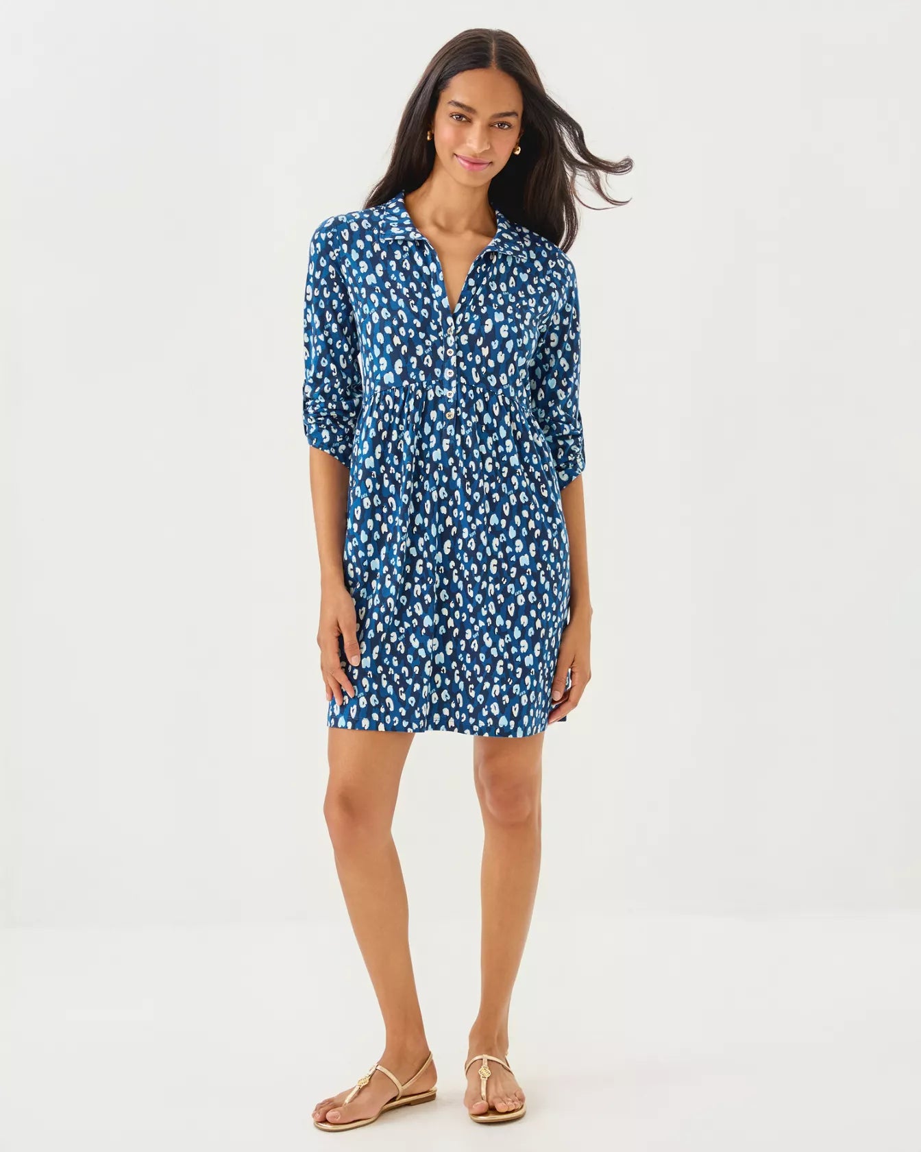 - Swing fit, popover shirtdress with a half placket, gold buttons, and 3/4 length sleeves with button roll tabs.