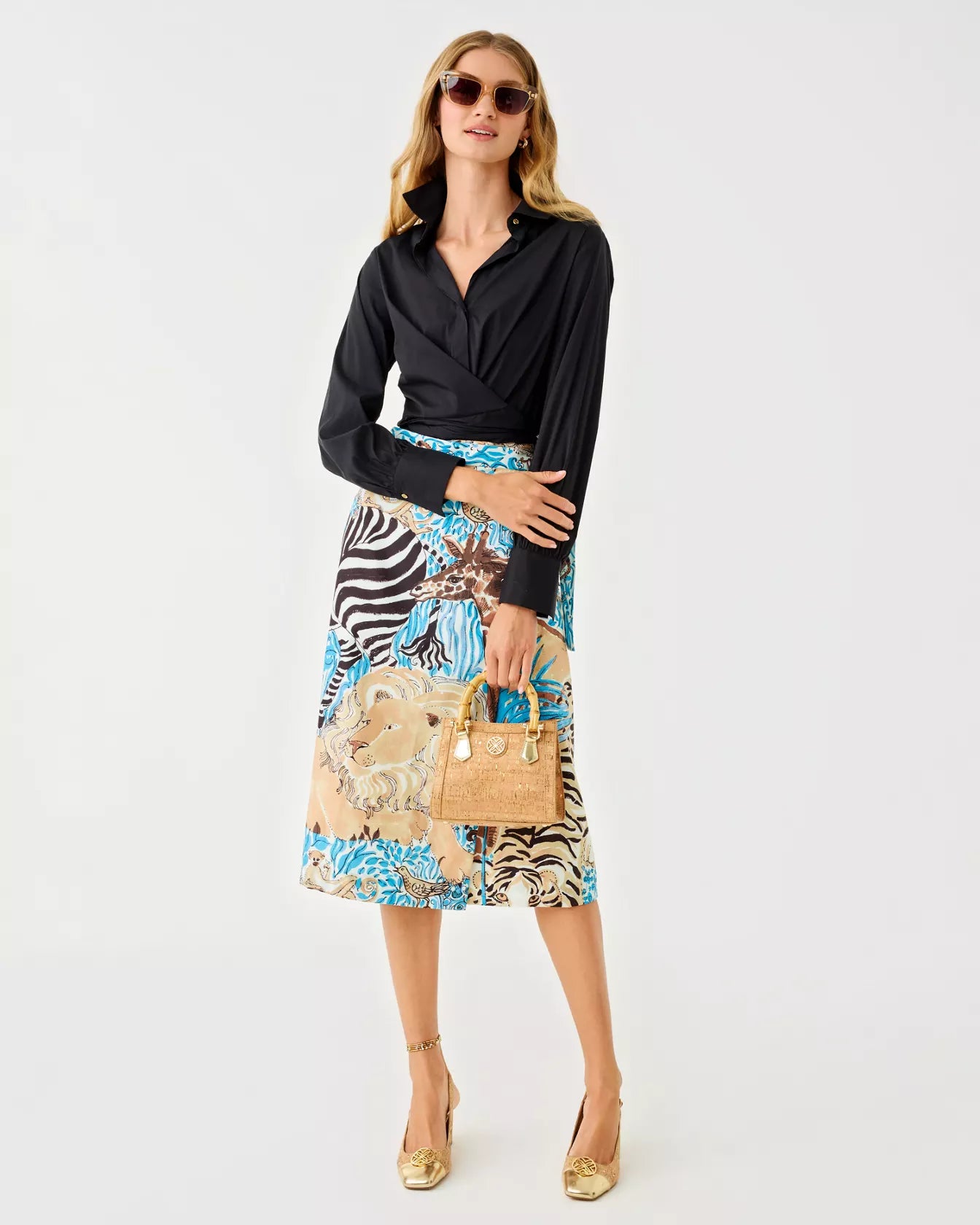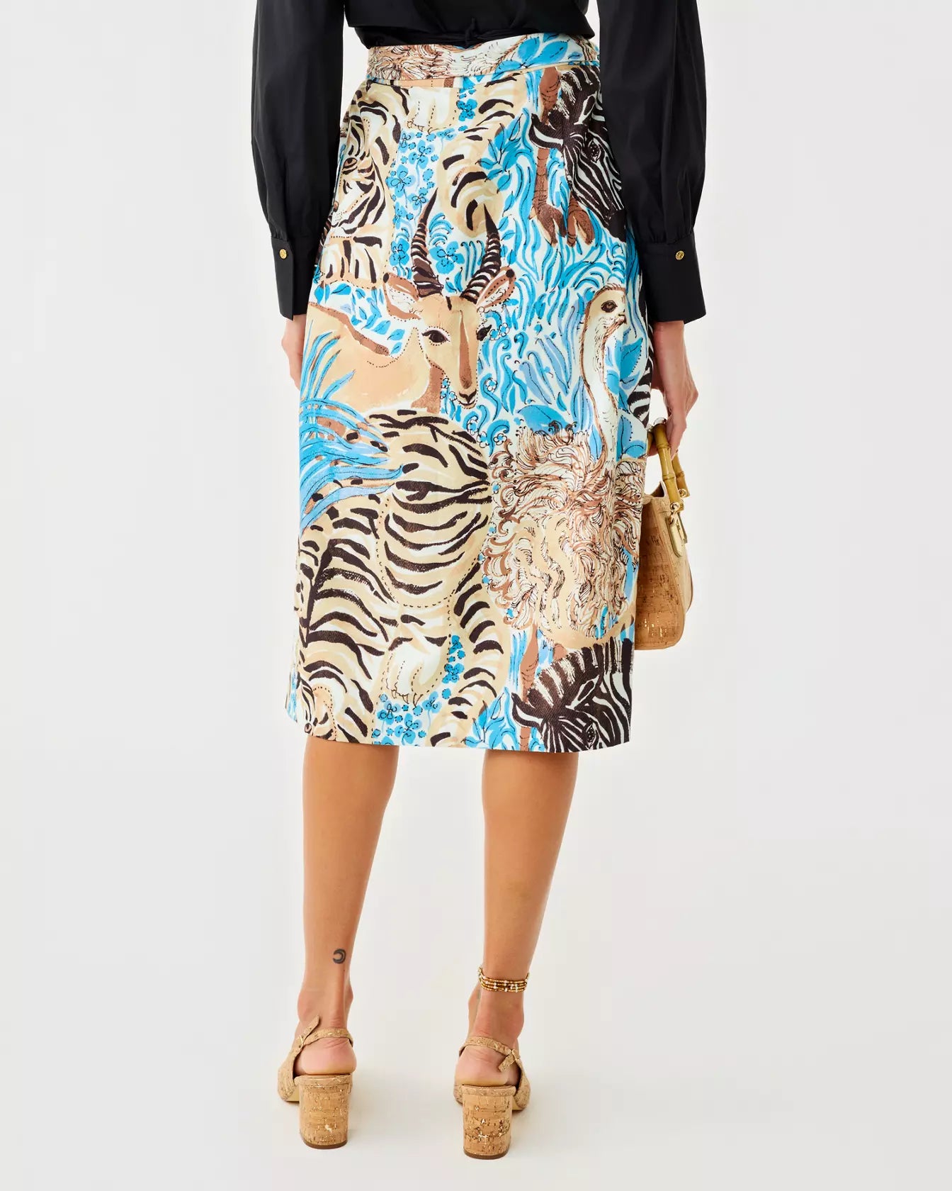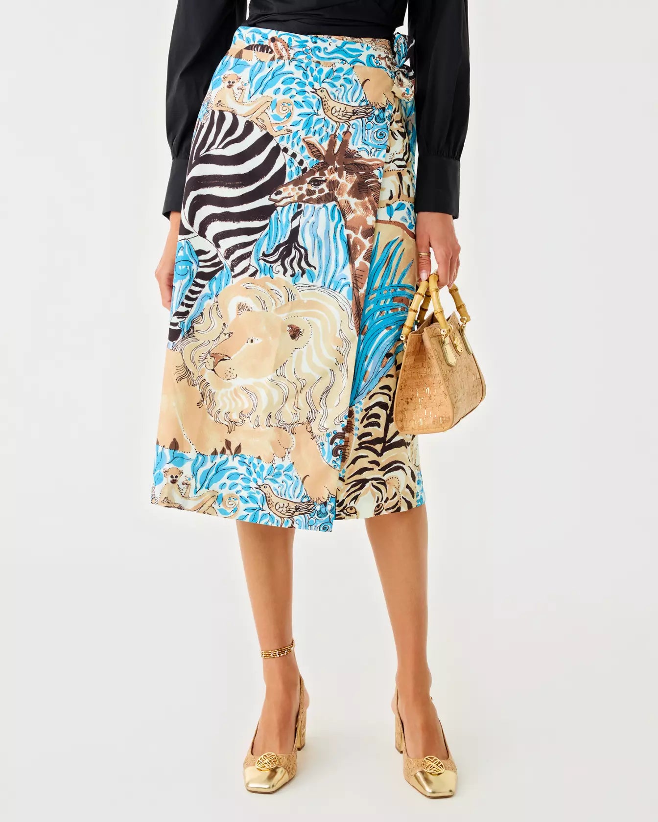 - High-rise, A-line, midi wrap skirt with a waistband and side seam pockets.
