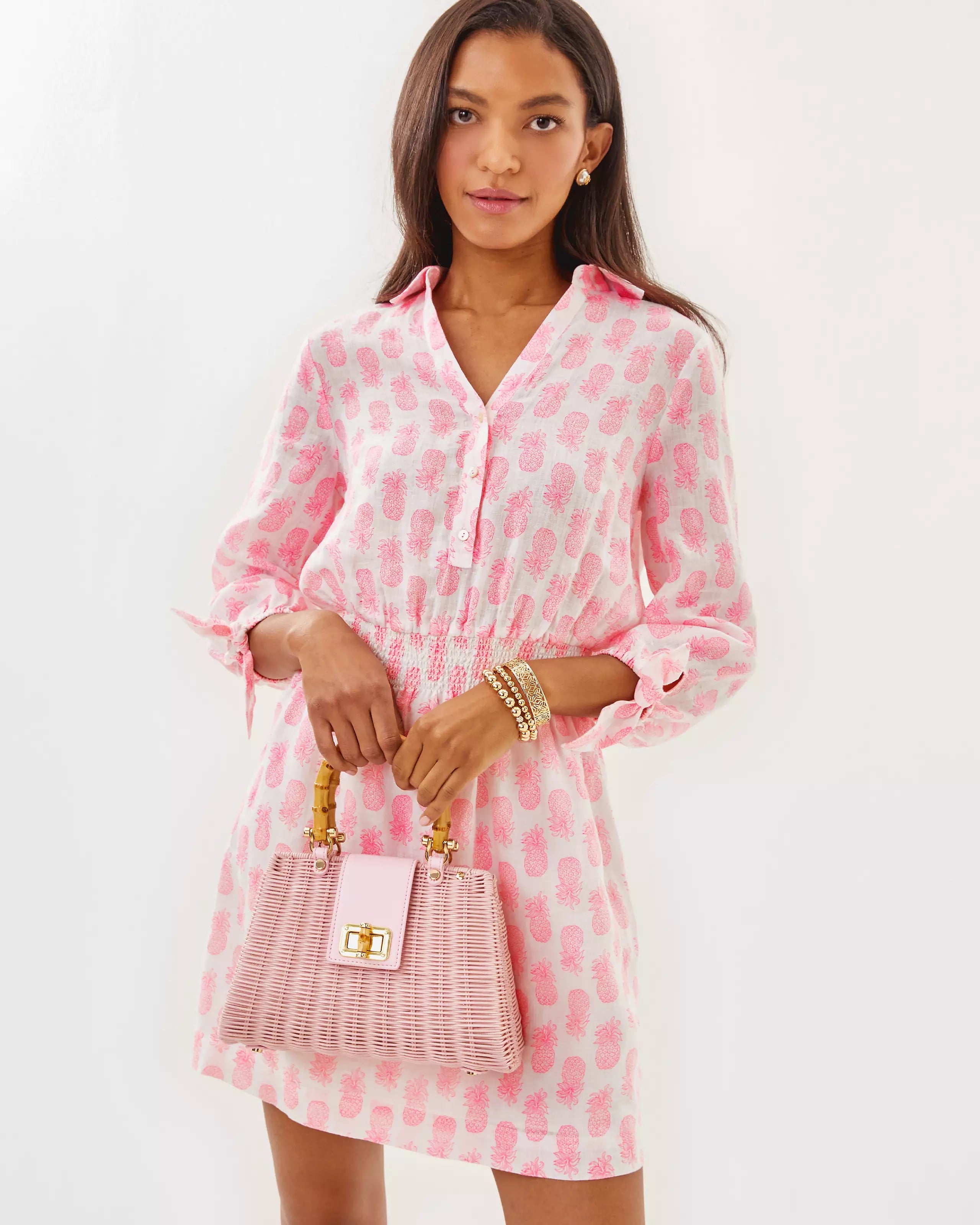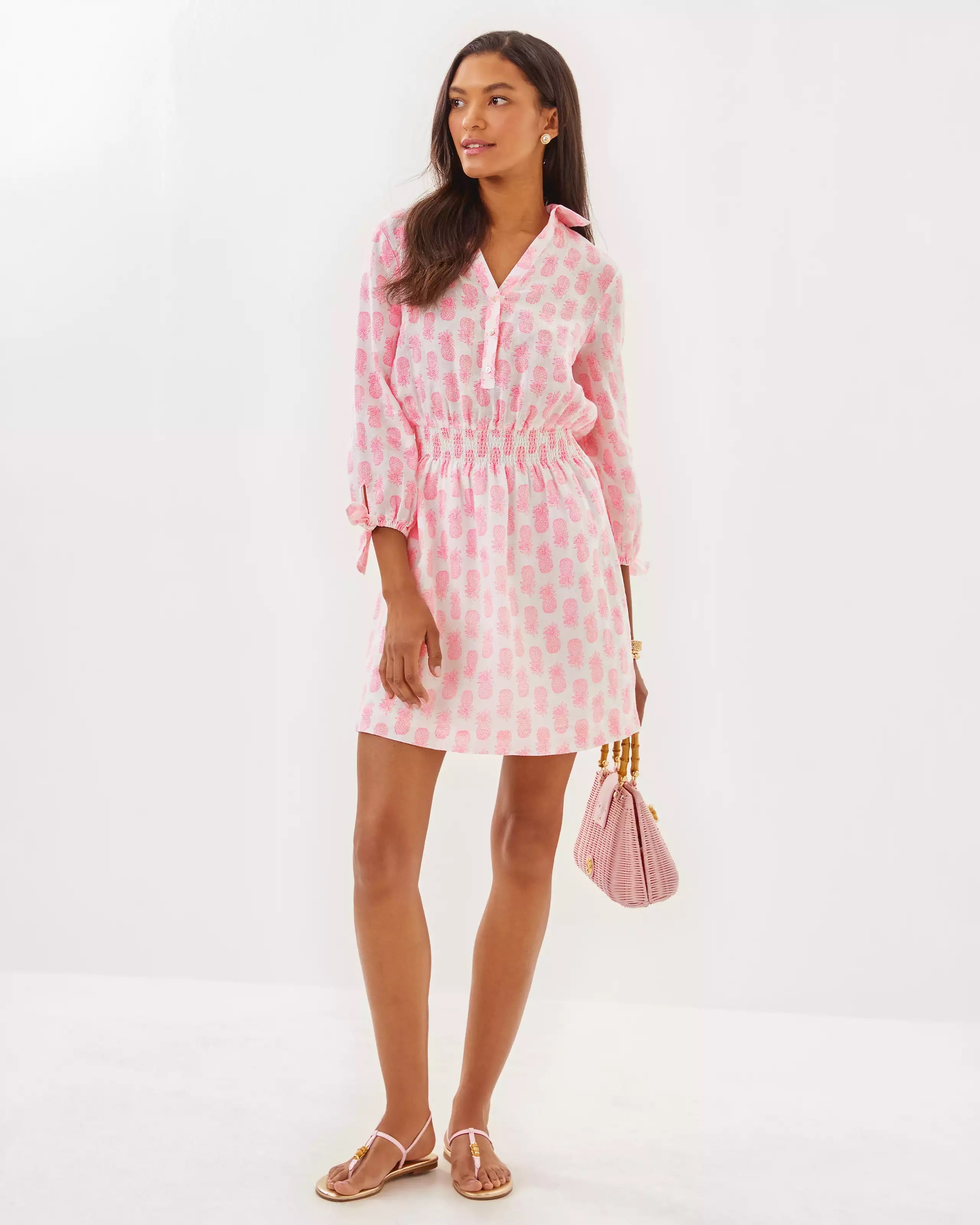• Easy fit, collared shirtdress with a half placket, smocked waist, and 3/4 length sleeves with tie details.