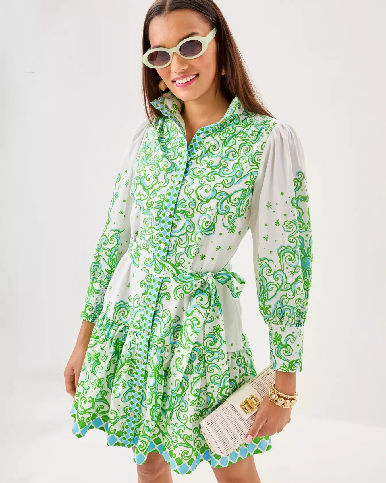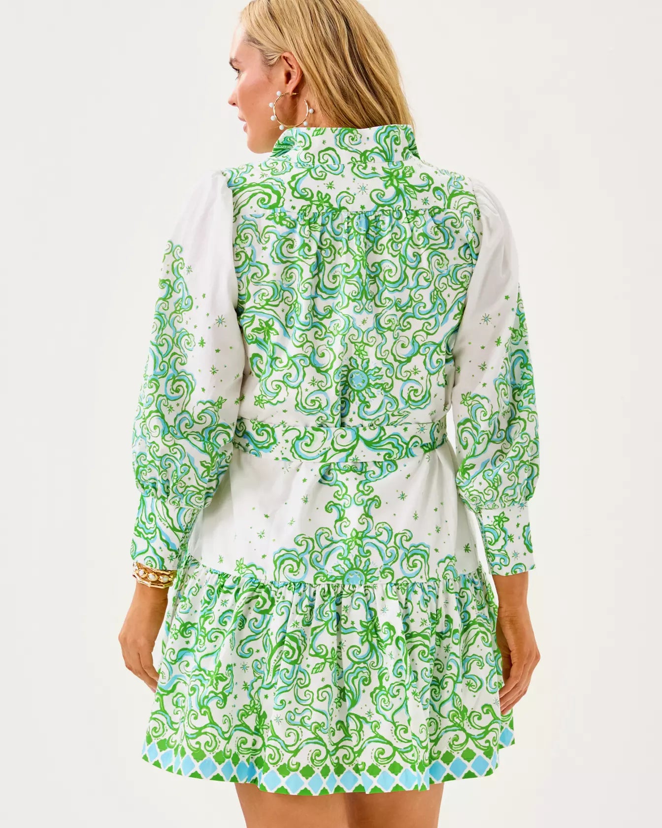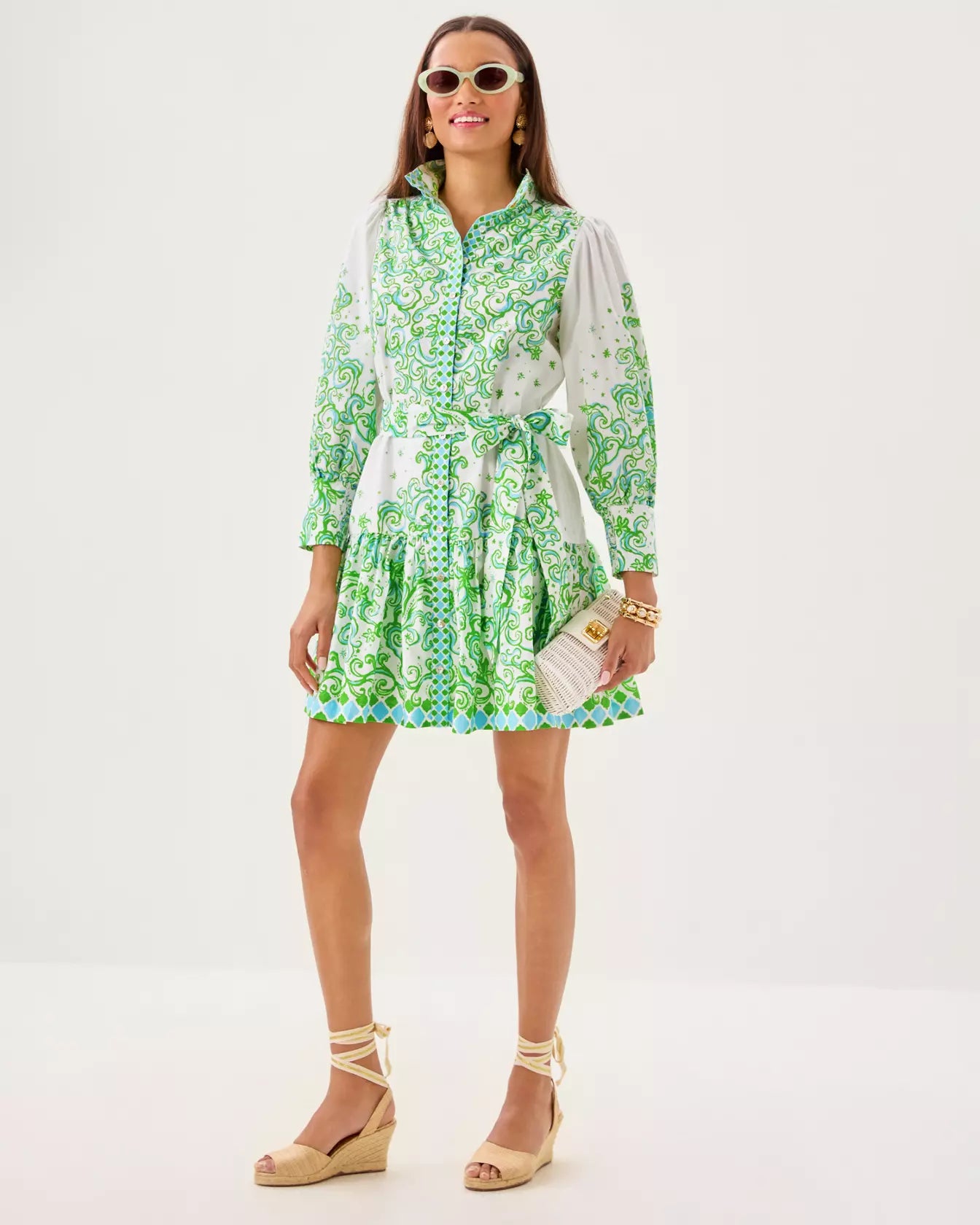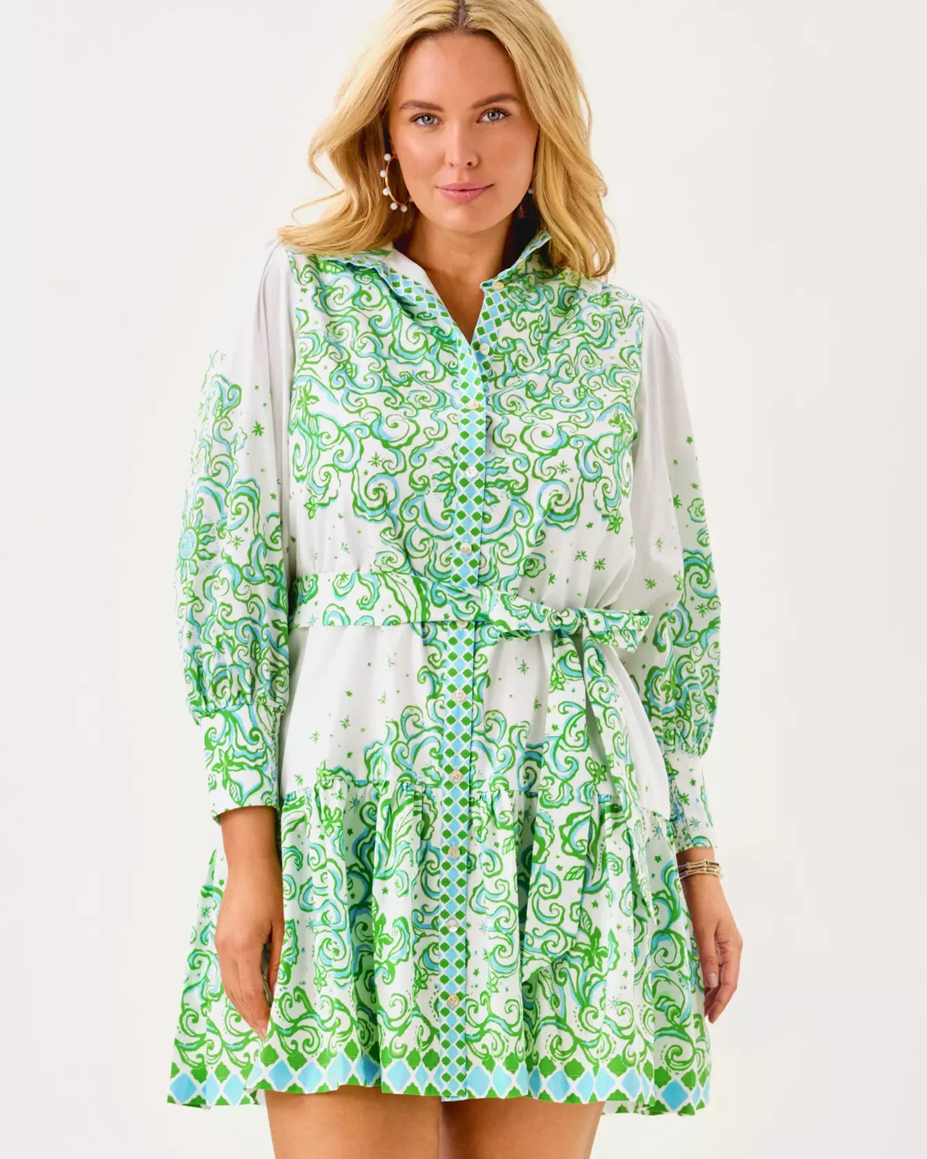 - Easy fit shirtdress with a button front, stand collar, and 3/4 length sleeves with tall cuffs. This style also features a hem ruffle and a separate sash.