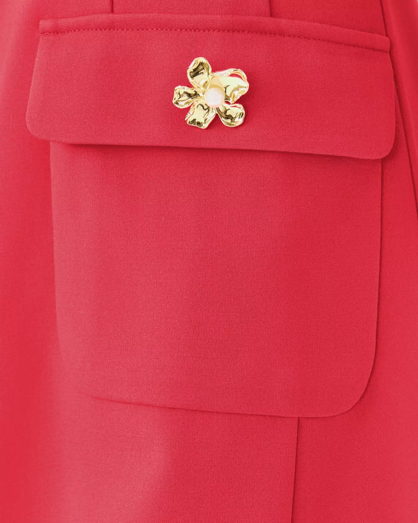 - Fit-and-flare, crew neck dress with short sleeves, seam details, and patch pockets with novelty gold buttons.