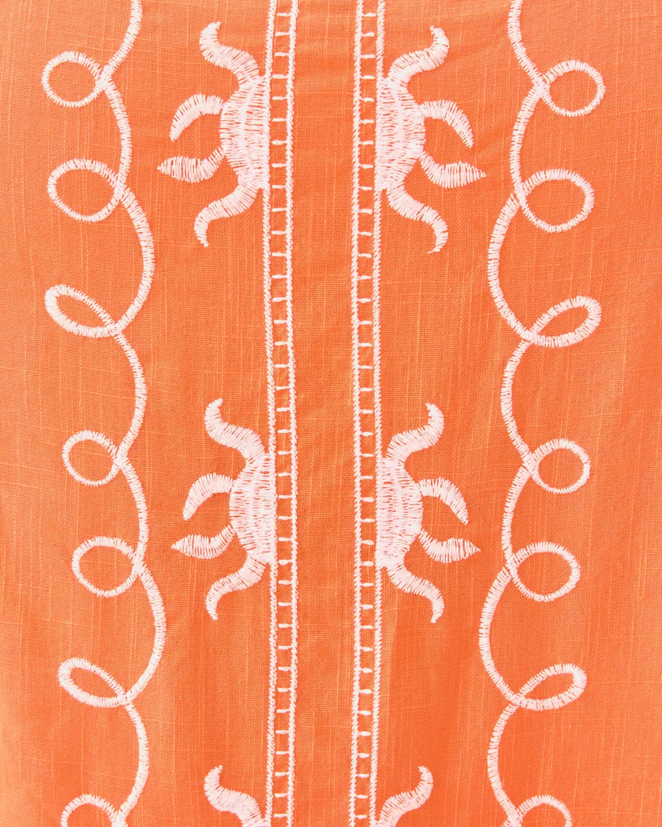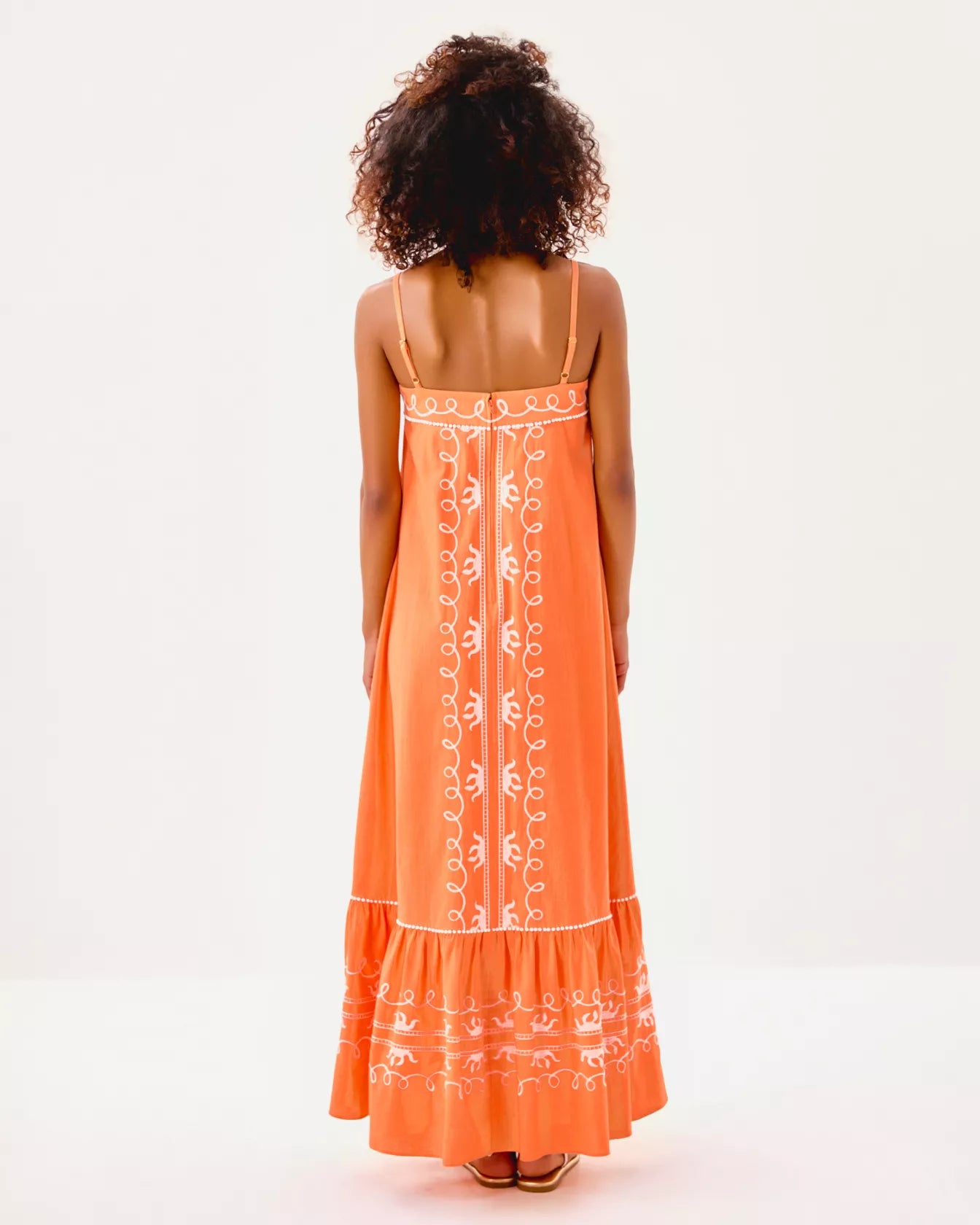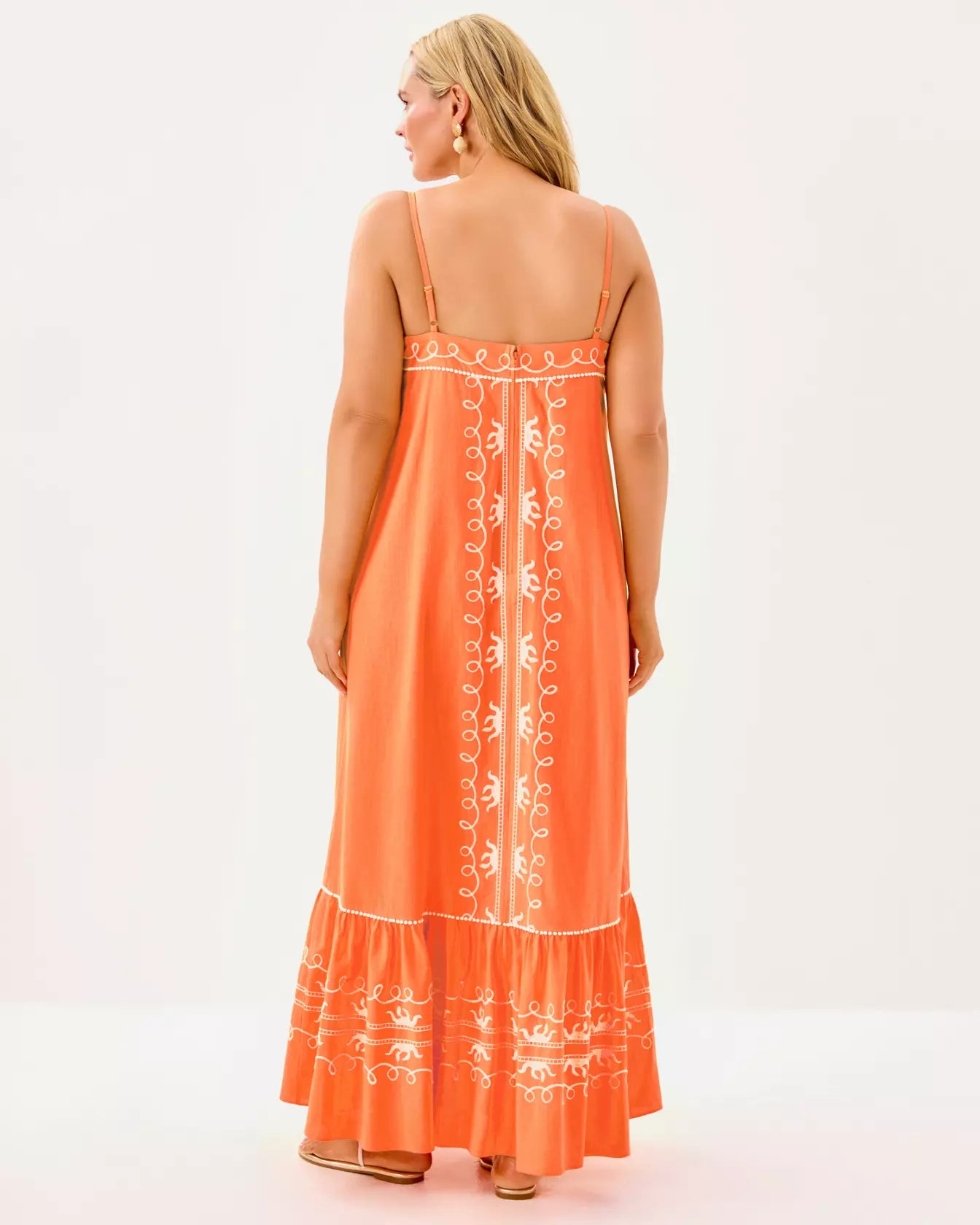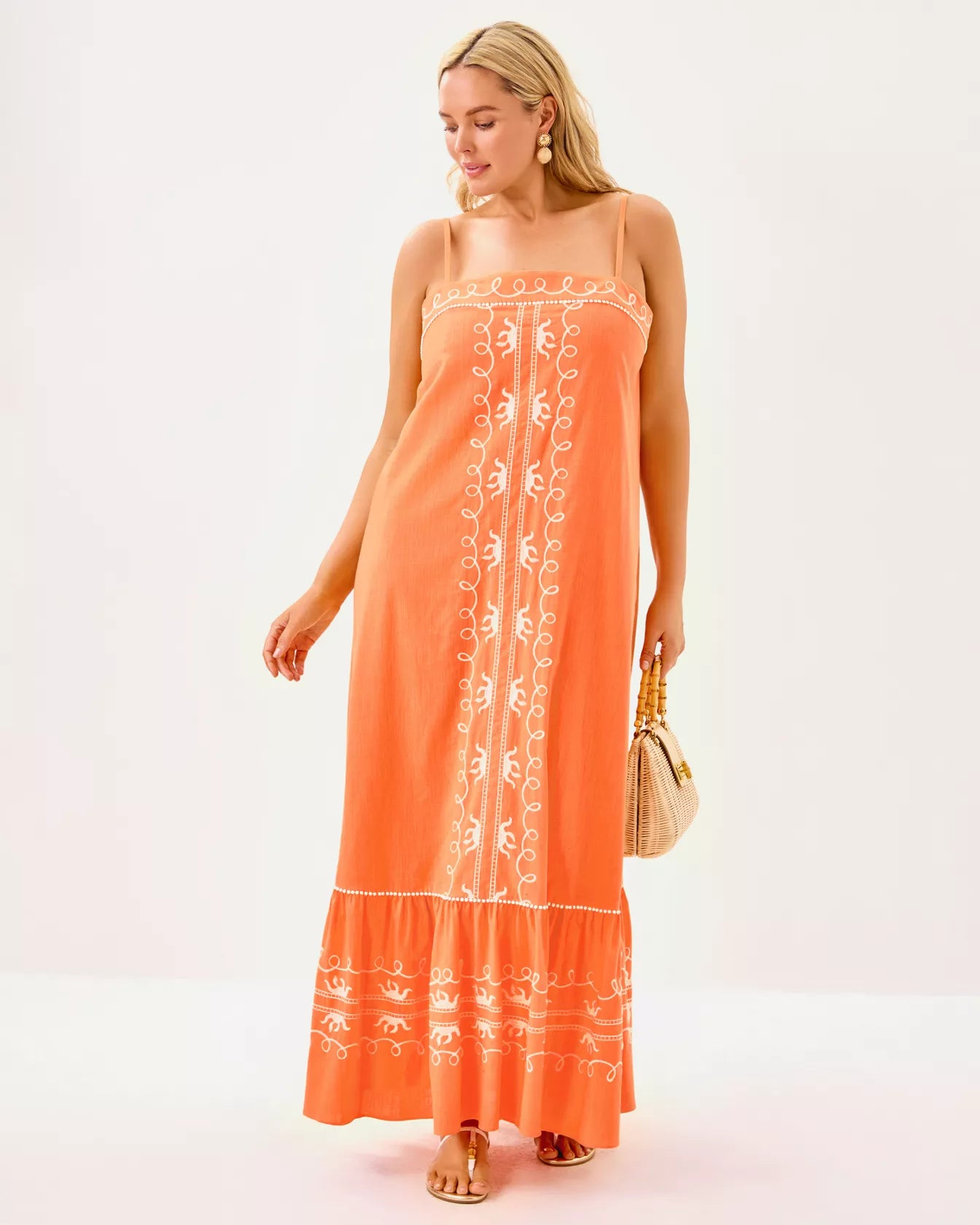 • Swing fit, embroidered maxi dress with adjustable spaghetti straps, interior shelf bra, and pockets. This style also features a tall hem ruffle and Lilly lace trim.