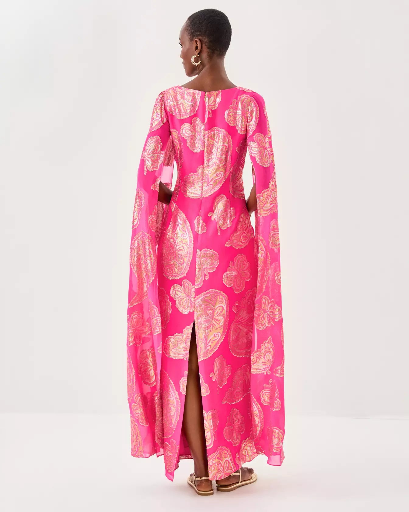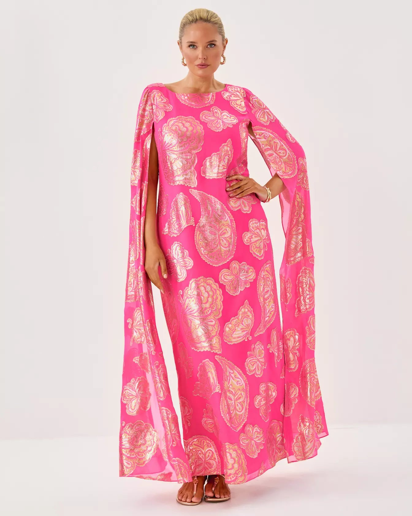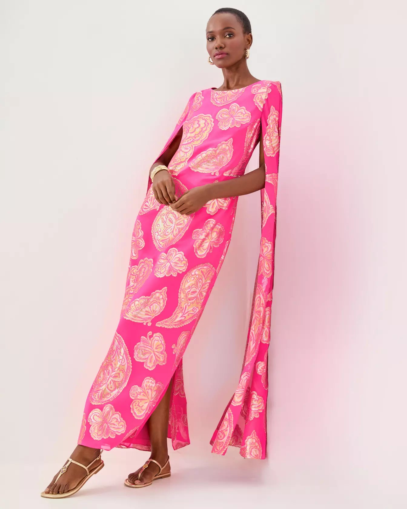 - Fitted, maxi caftan with a boat neckline and cape sleeves.