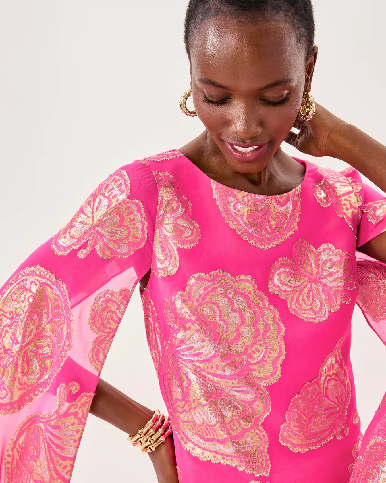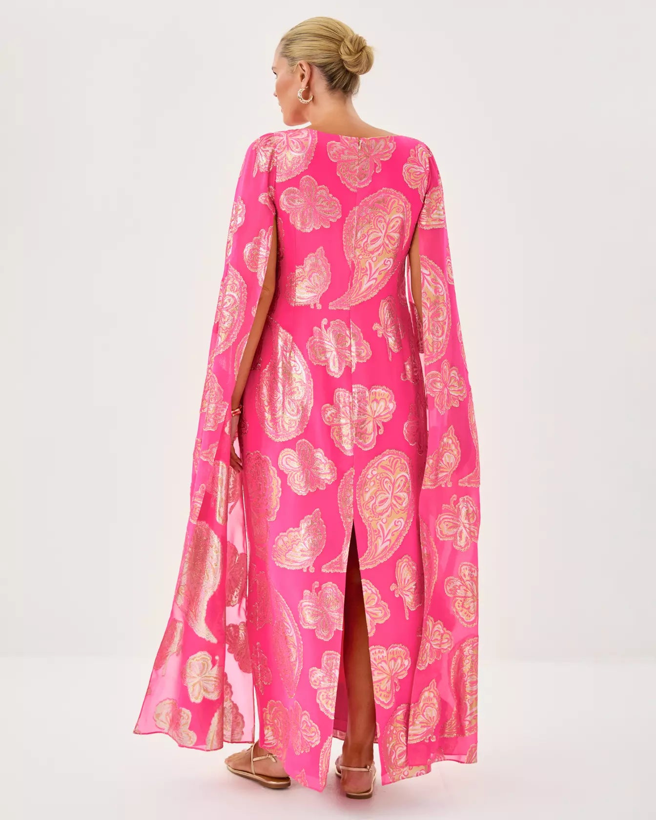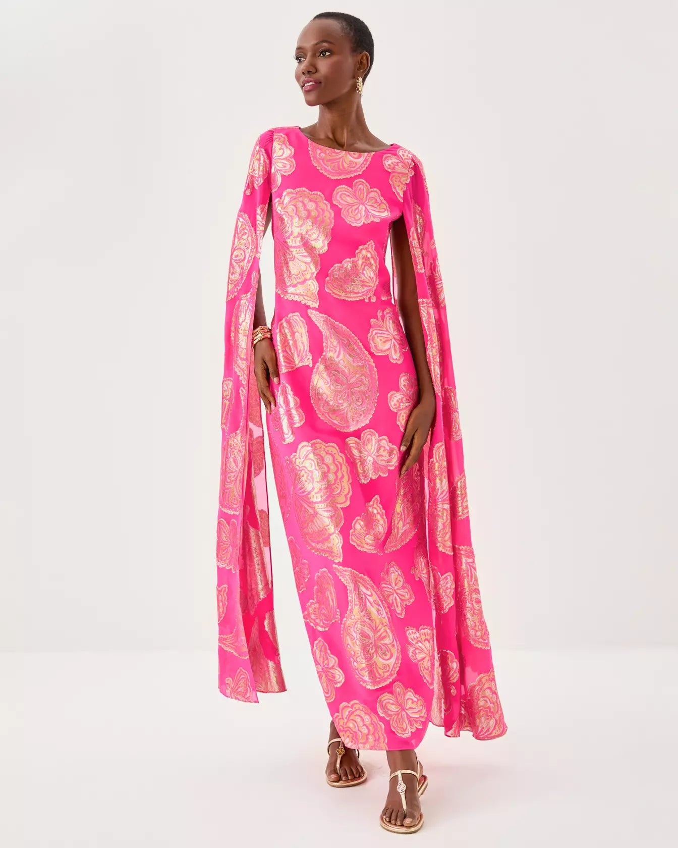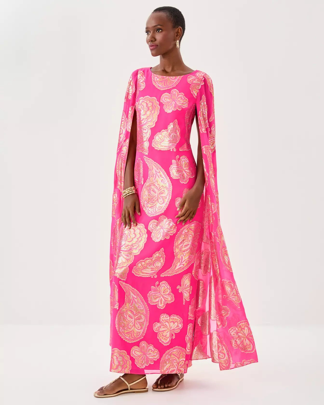 - Fitted, maxi caftan with a boat neckline and cape sleeves.