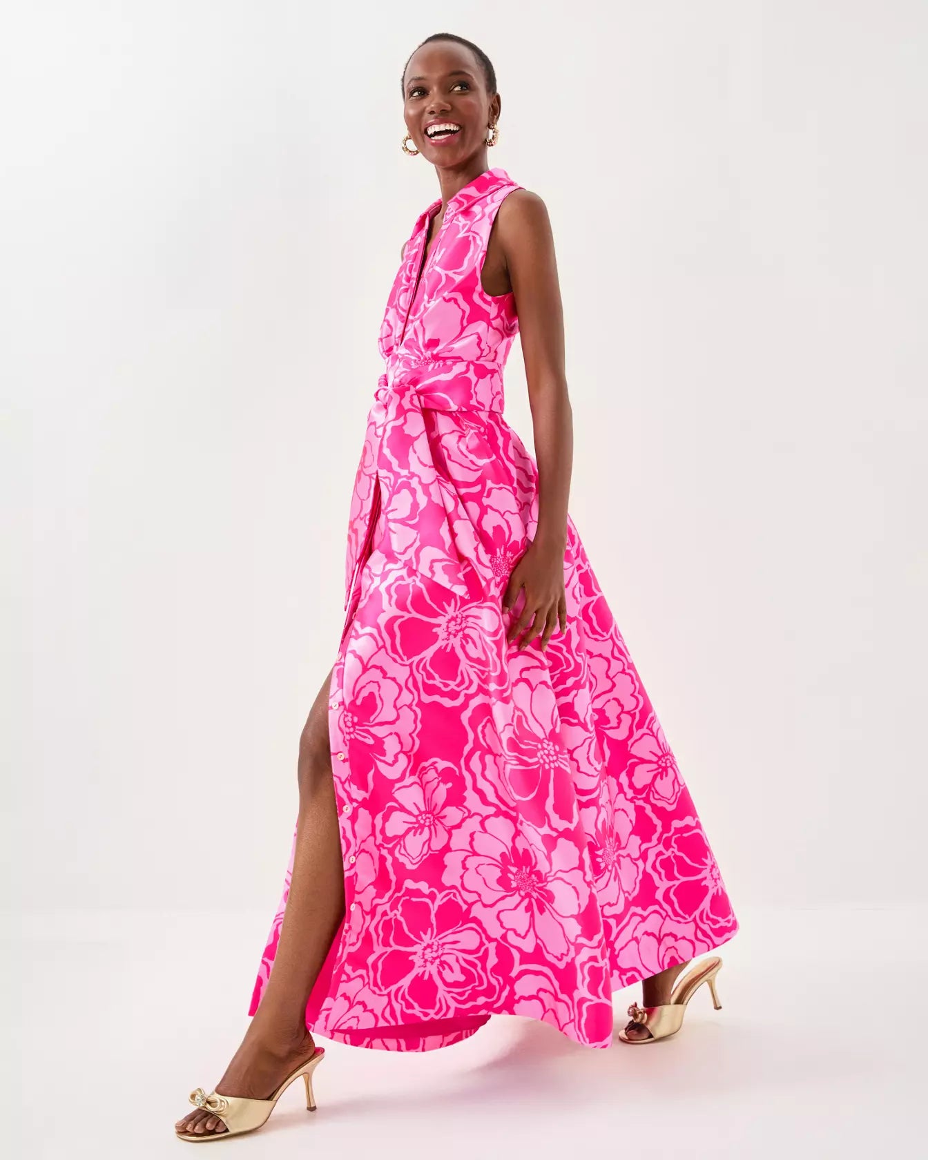 - Fit-and-flare, maxi shirtdress with a wrap waist tie detail, pleated skirt, and side seam pockets.