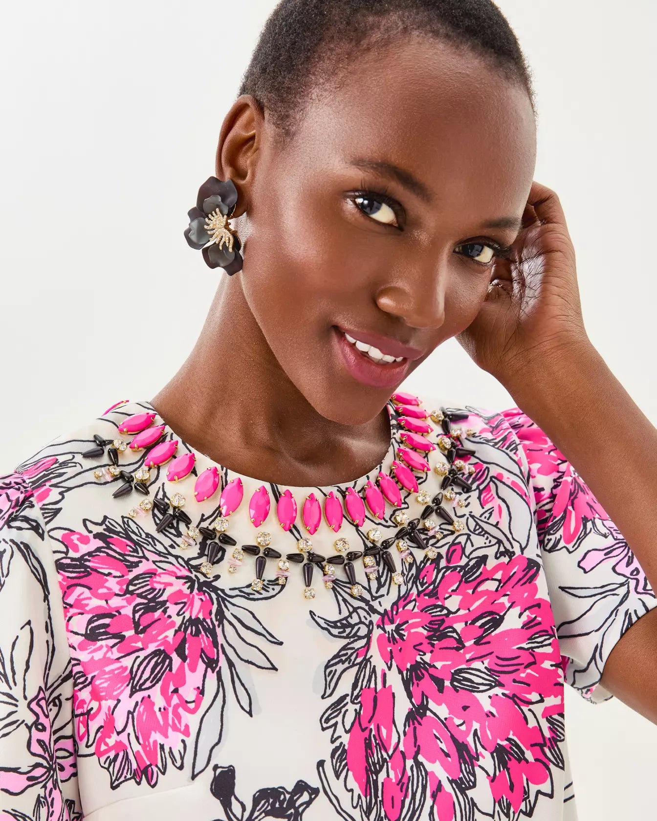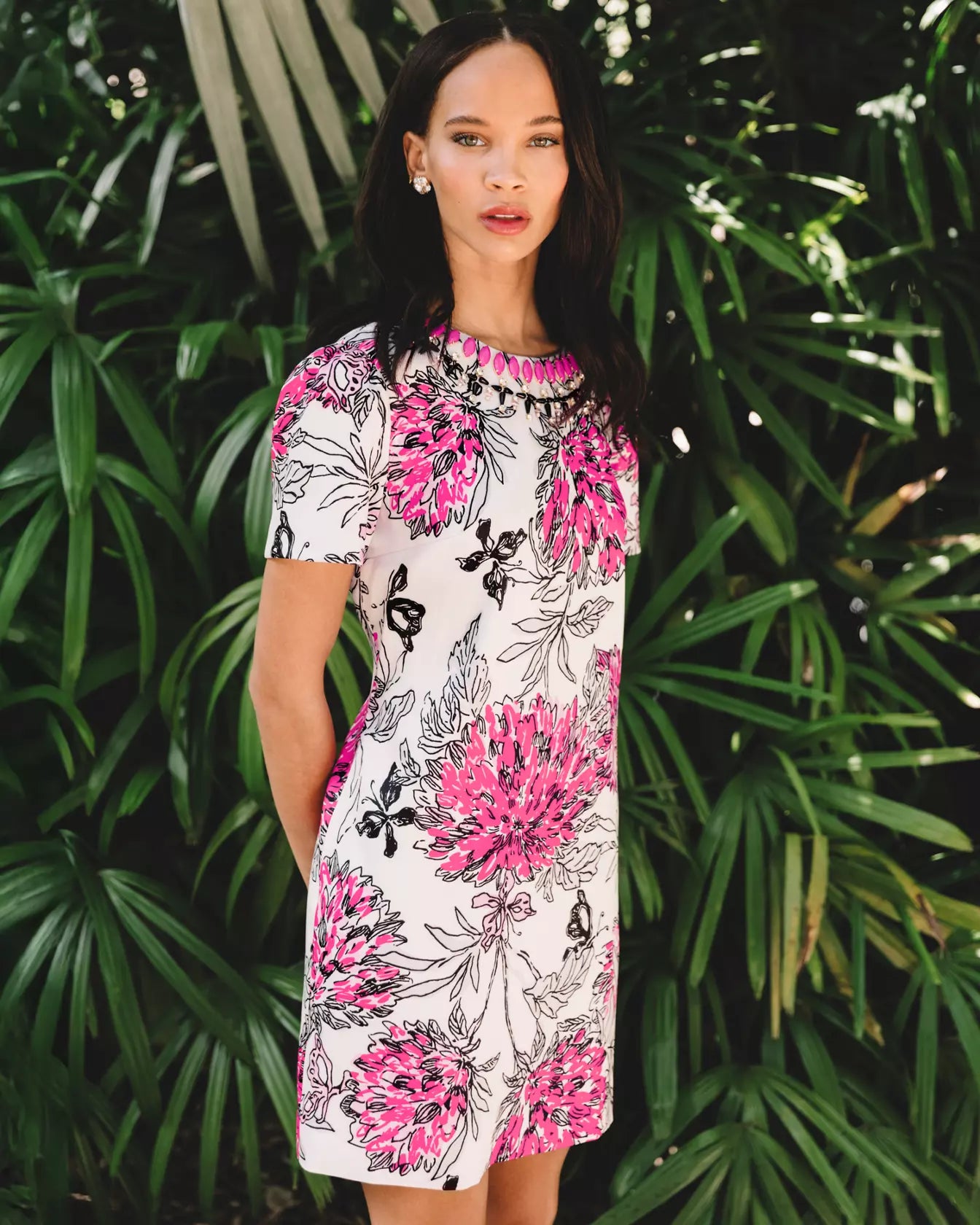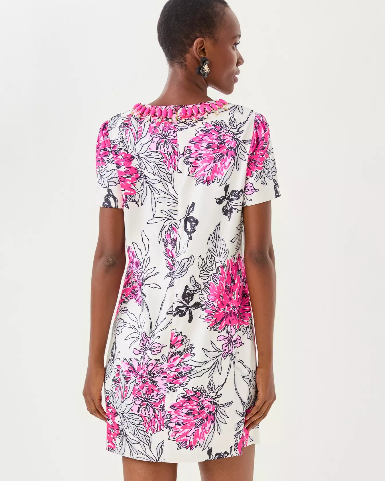 - Straight fit, short sleeve shift dress with a beaded crew neckline.