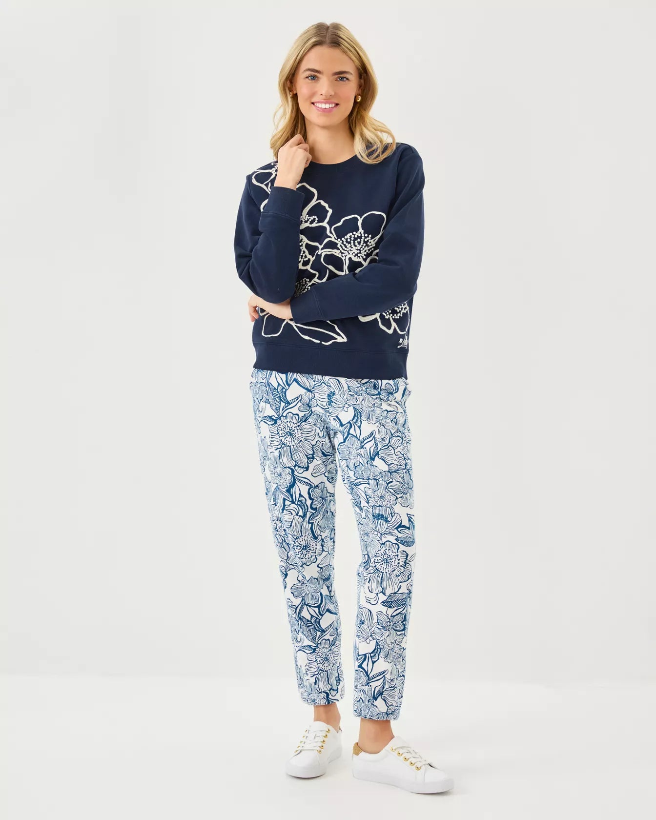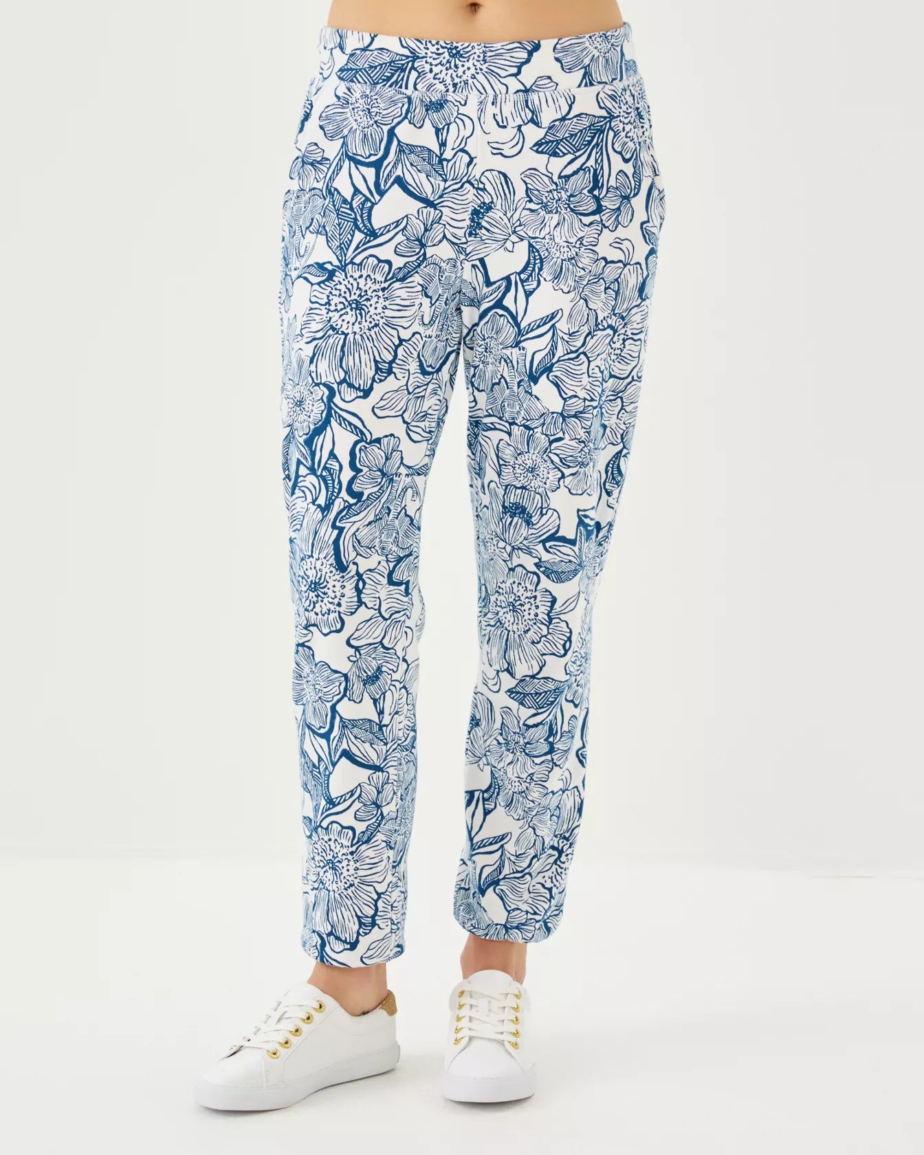 - Mid-rise, relaxed fit, pull-on pant with front pockets.