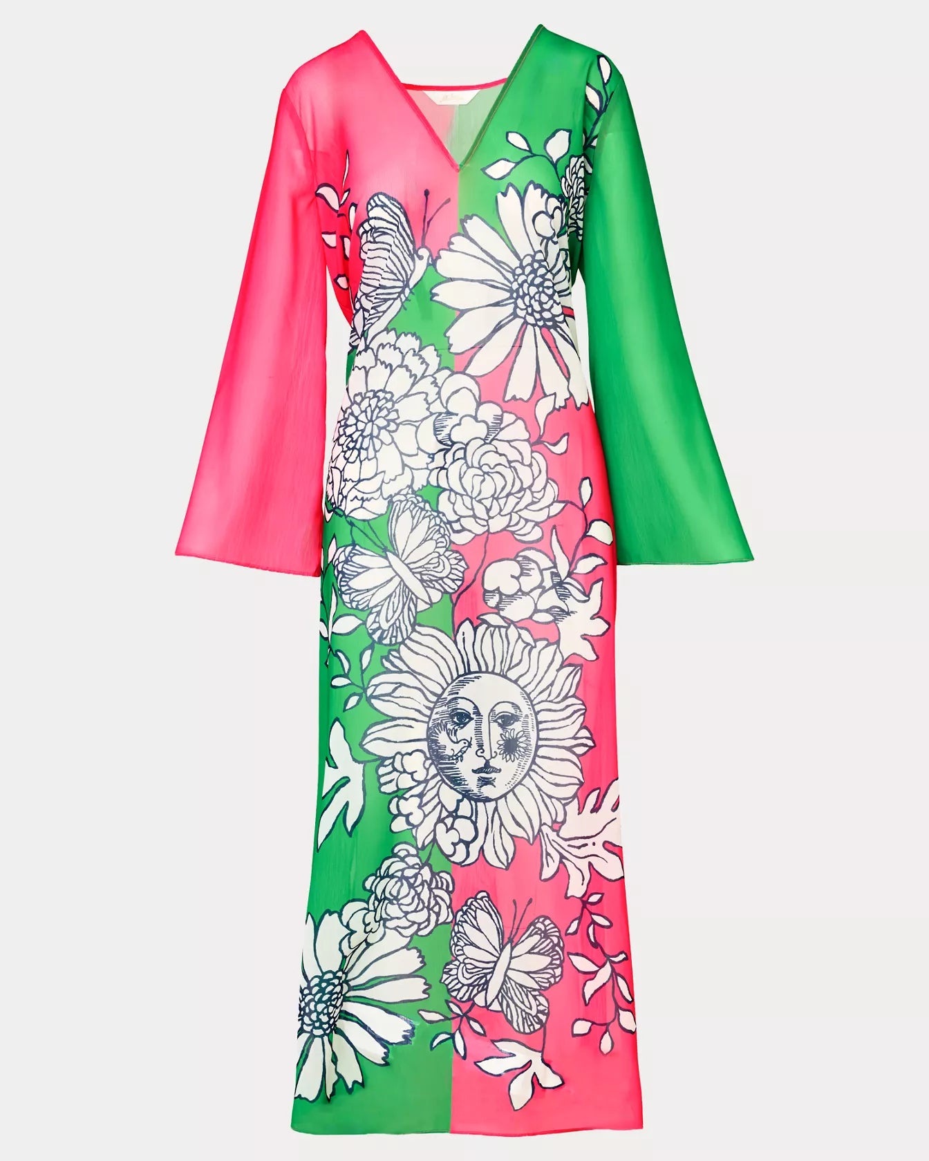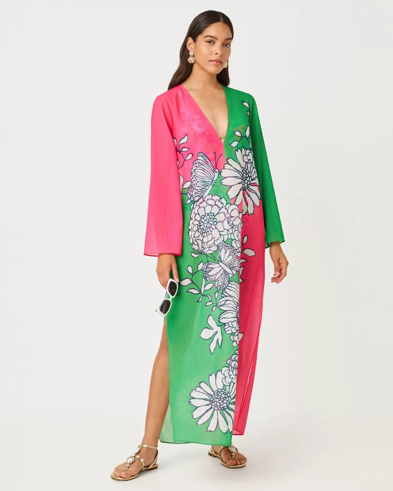 • V-neck, maxi cover-up with long sleeves and side slits.