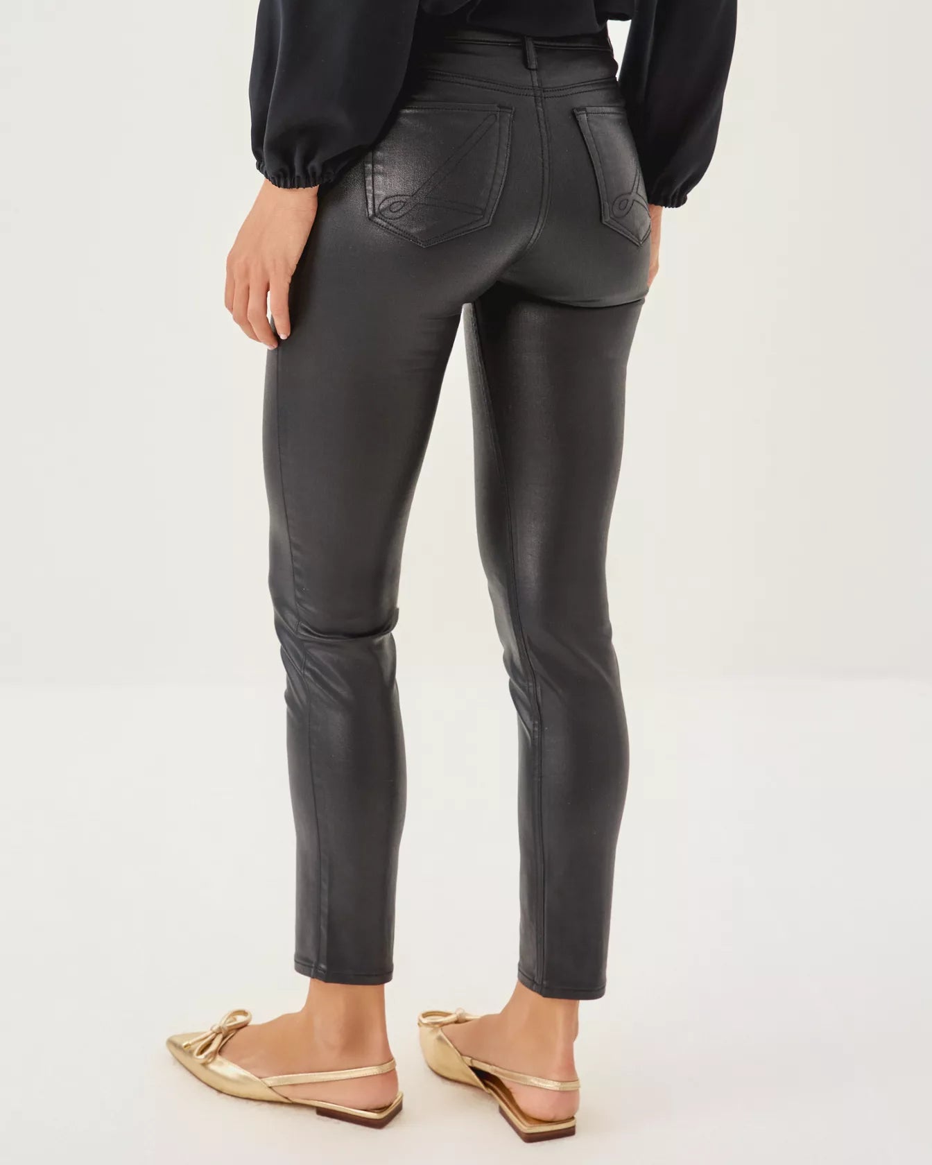 - Black Coated Stretch Denim (59% Rayon, 39% Polyester, 2% Spandex).