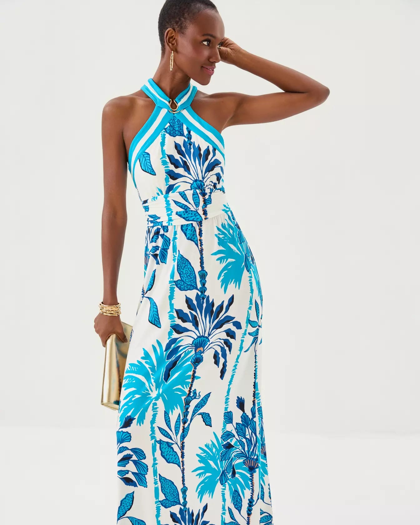 - Fit-and-flare maxi dress with a halter neckline, gold hardware, and interior bodice cups. This style also features a ruched waistband and functional back neck tie.