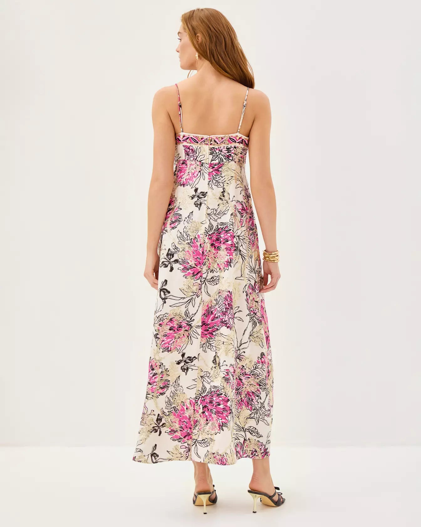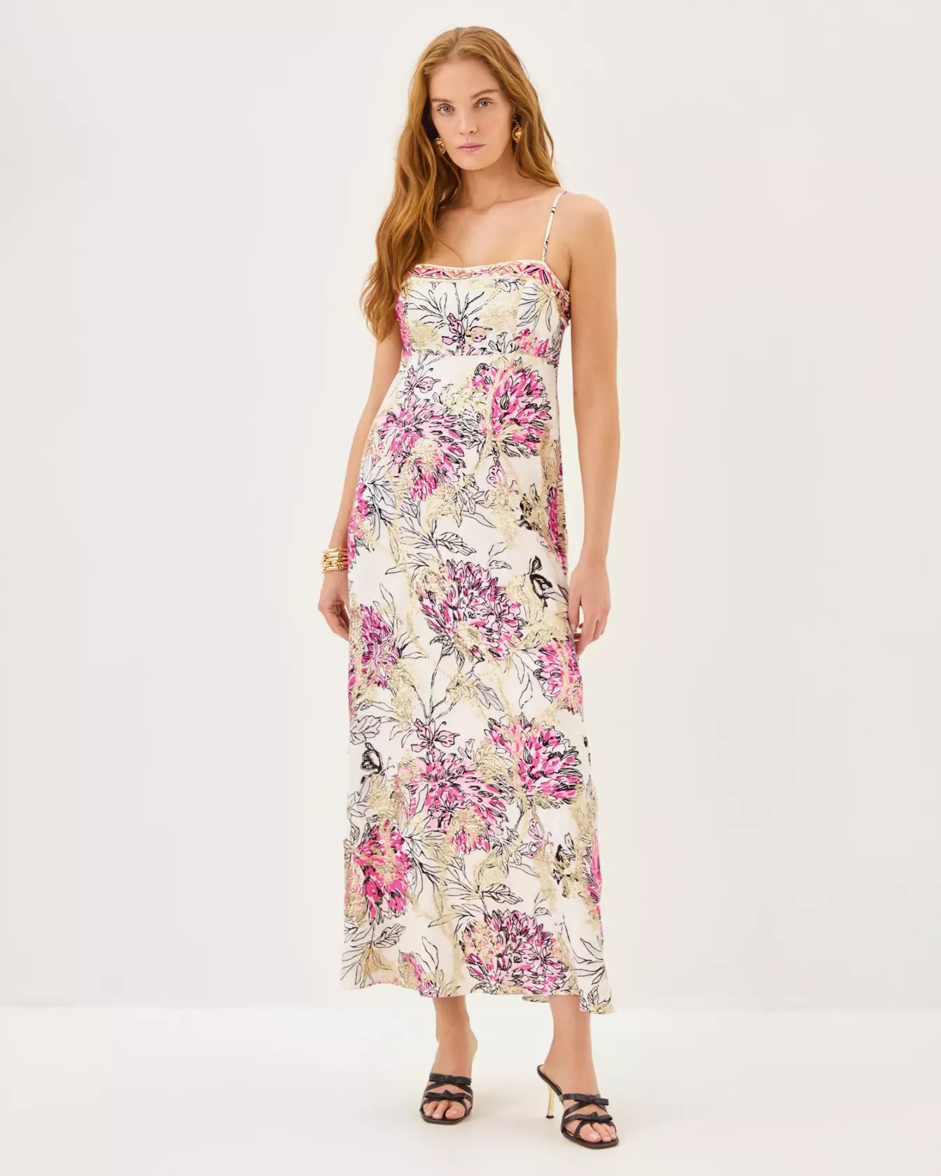 - Fit-and-flare maxi dress with adjustable spaghetti straps, a beaded neckband, and an empire waist.