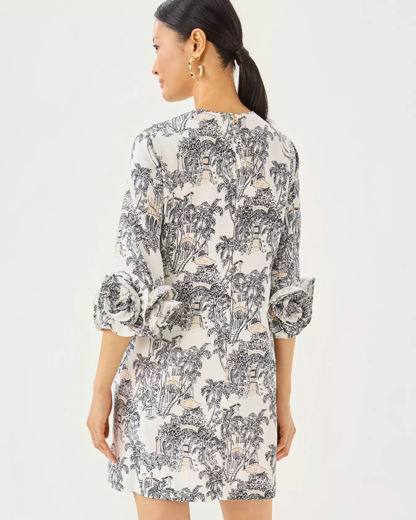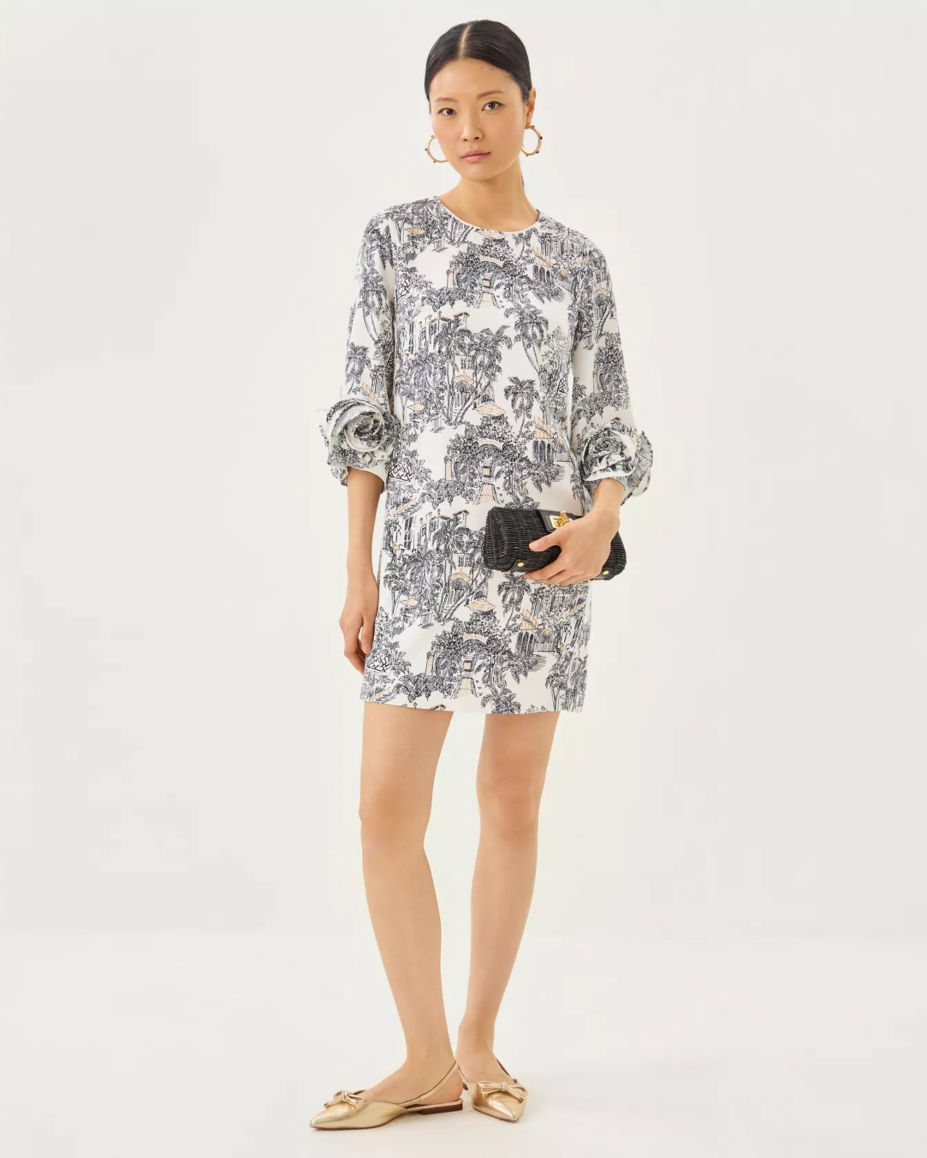 • Straight fit, crew neck shift dress with 3/4 length bell sleeves and rosette detail.