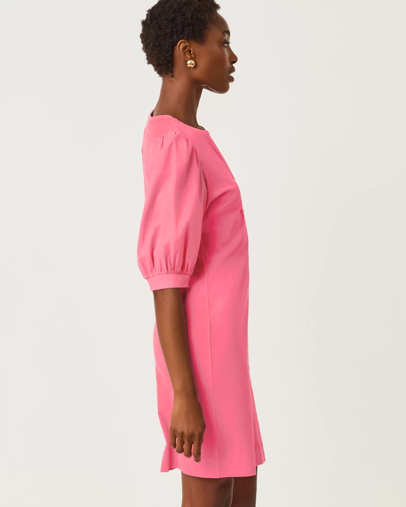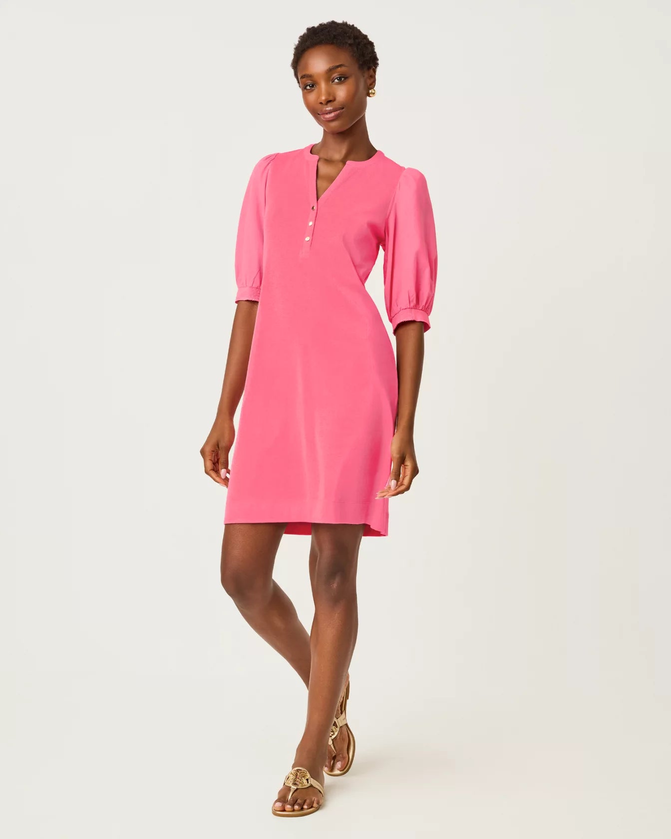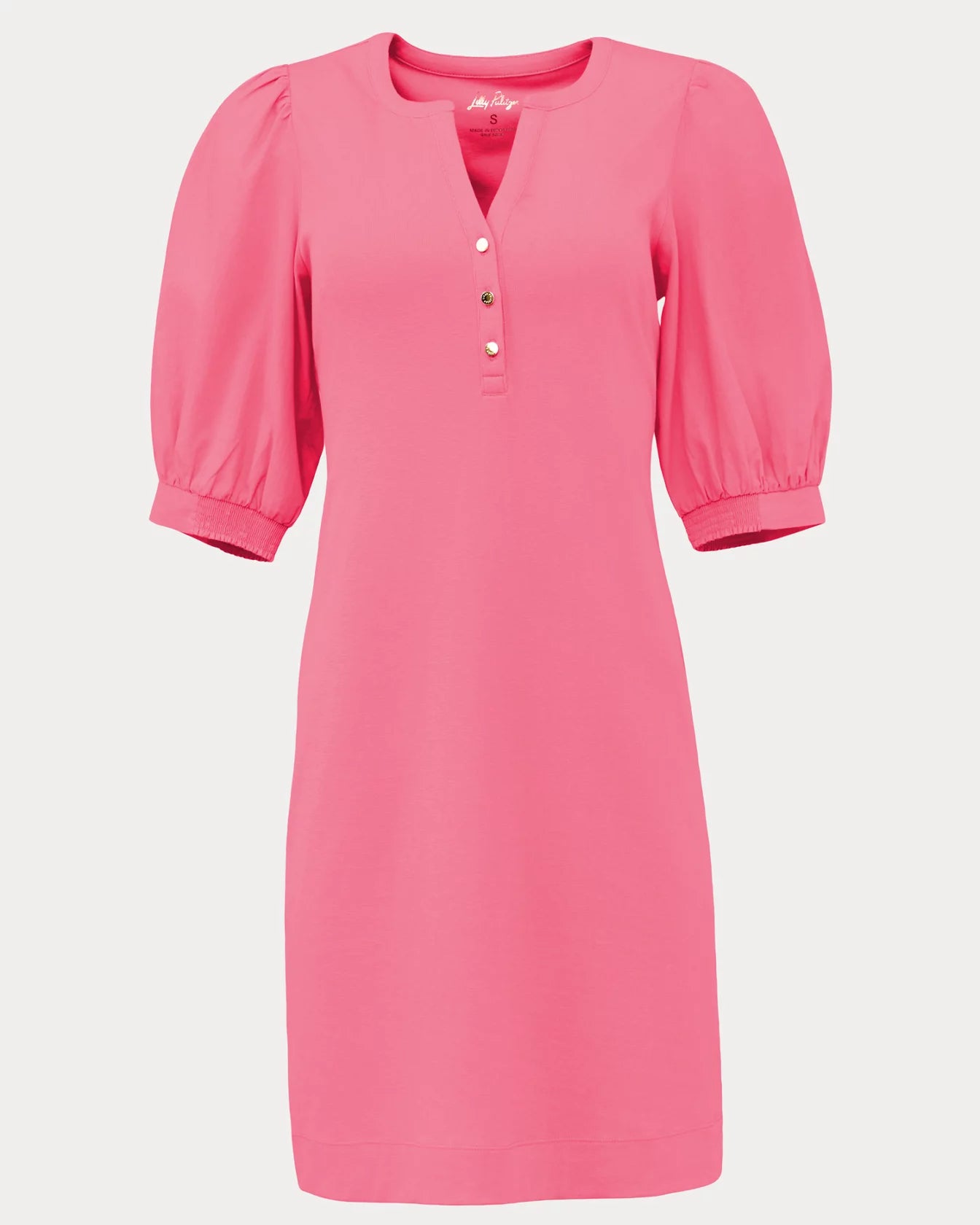 - Straight fit, popover dress with a crew notched neckline, gold buttons, and woven sleeves.